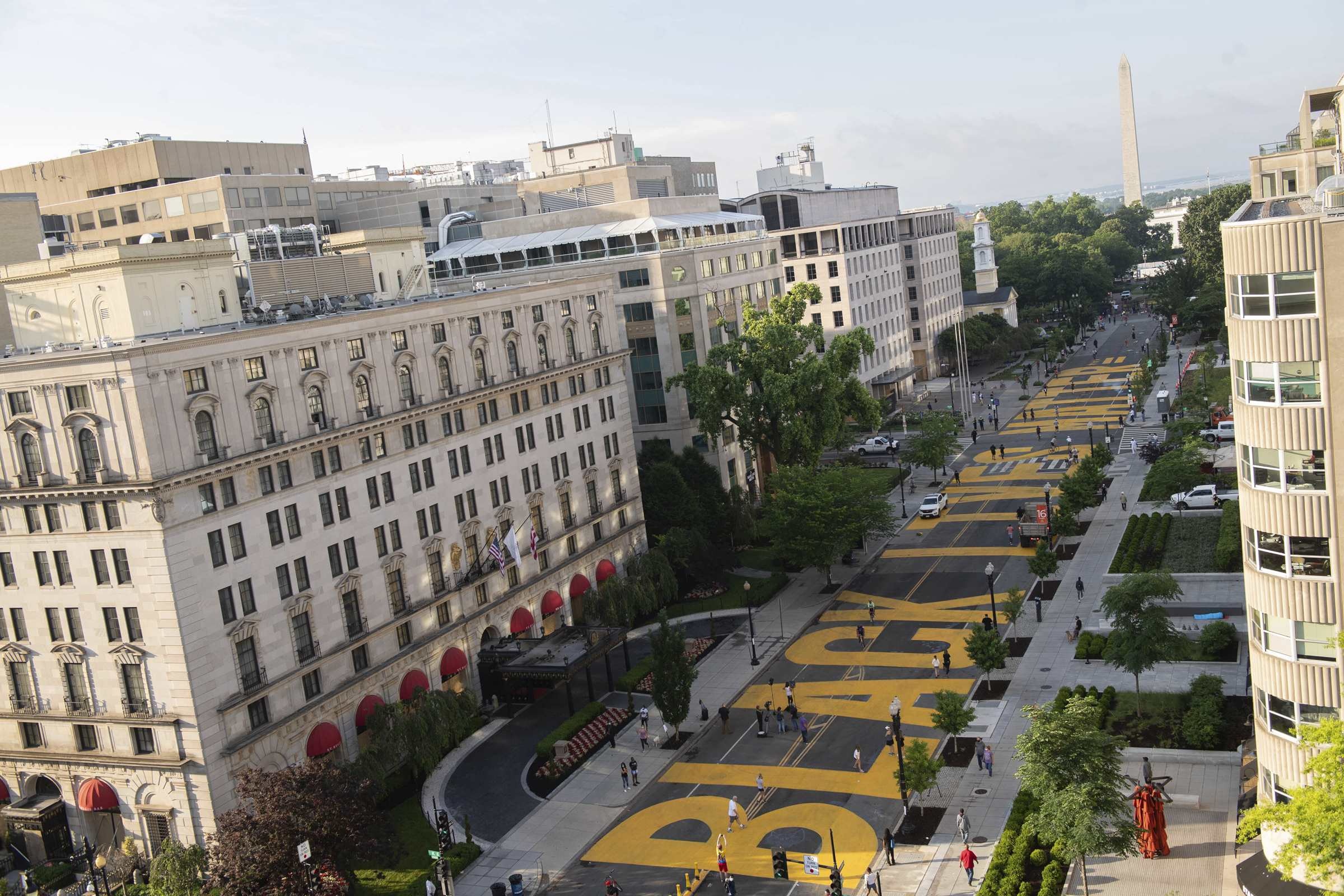 4 {. j$ f, T0 `$ |示威者在白宮附近的第16街上用鮮黃色字母塗寫抗議口號。(AP)tvb now,tvbnow,bttvb" G/ n, x, |' B$ o" z$ m