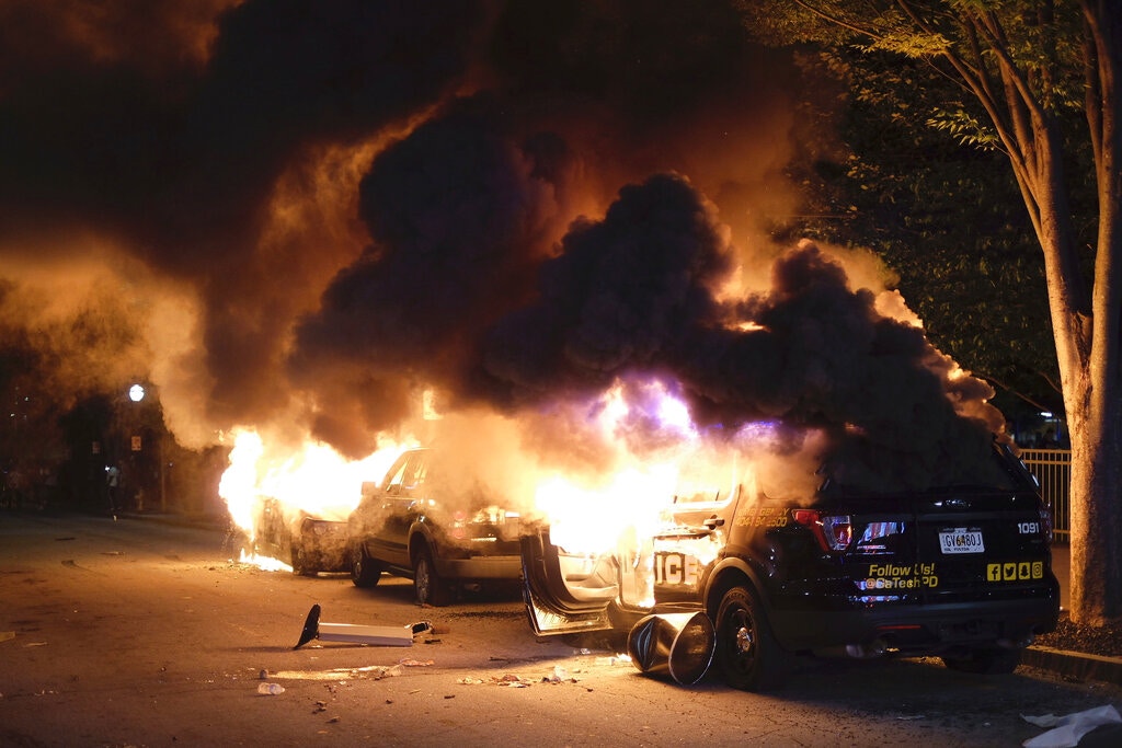 美國示威:特朗普6月1日發表全國講話,威脅將派成千上萬全副武裝的軍人平息騷亂,被指激發更多人上街示威。圖攝於5月30日,在費城舉行的喬治·弗洛伊德抗議活動中,示威者焚燒一輛警車。(AP)