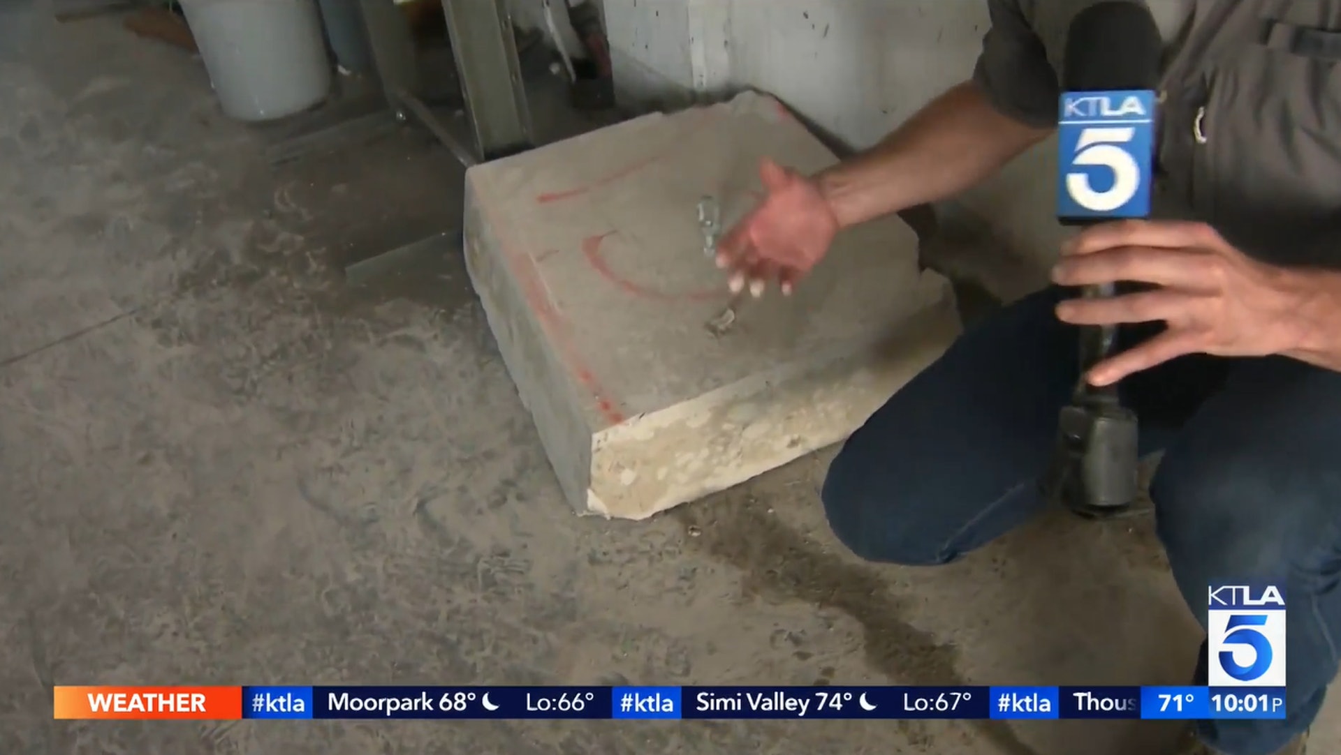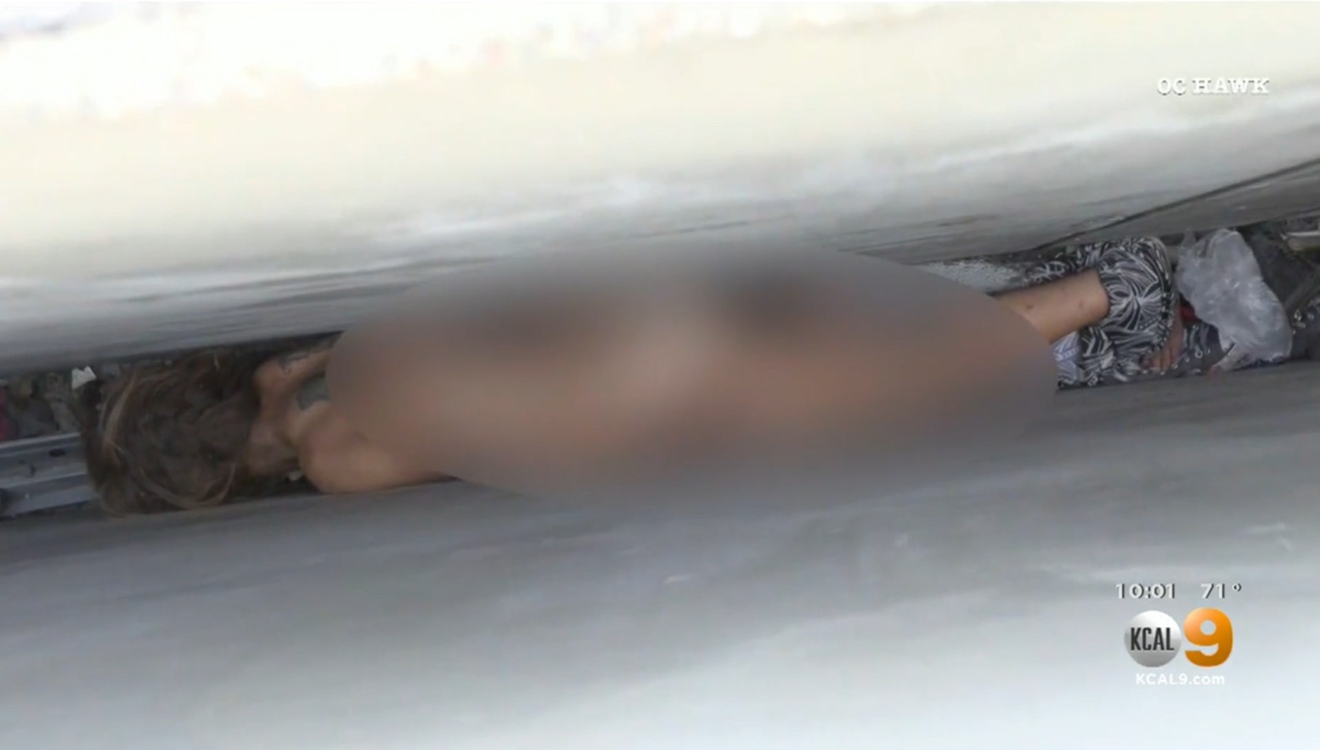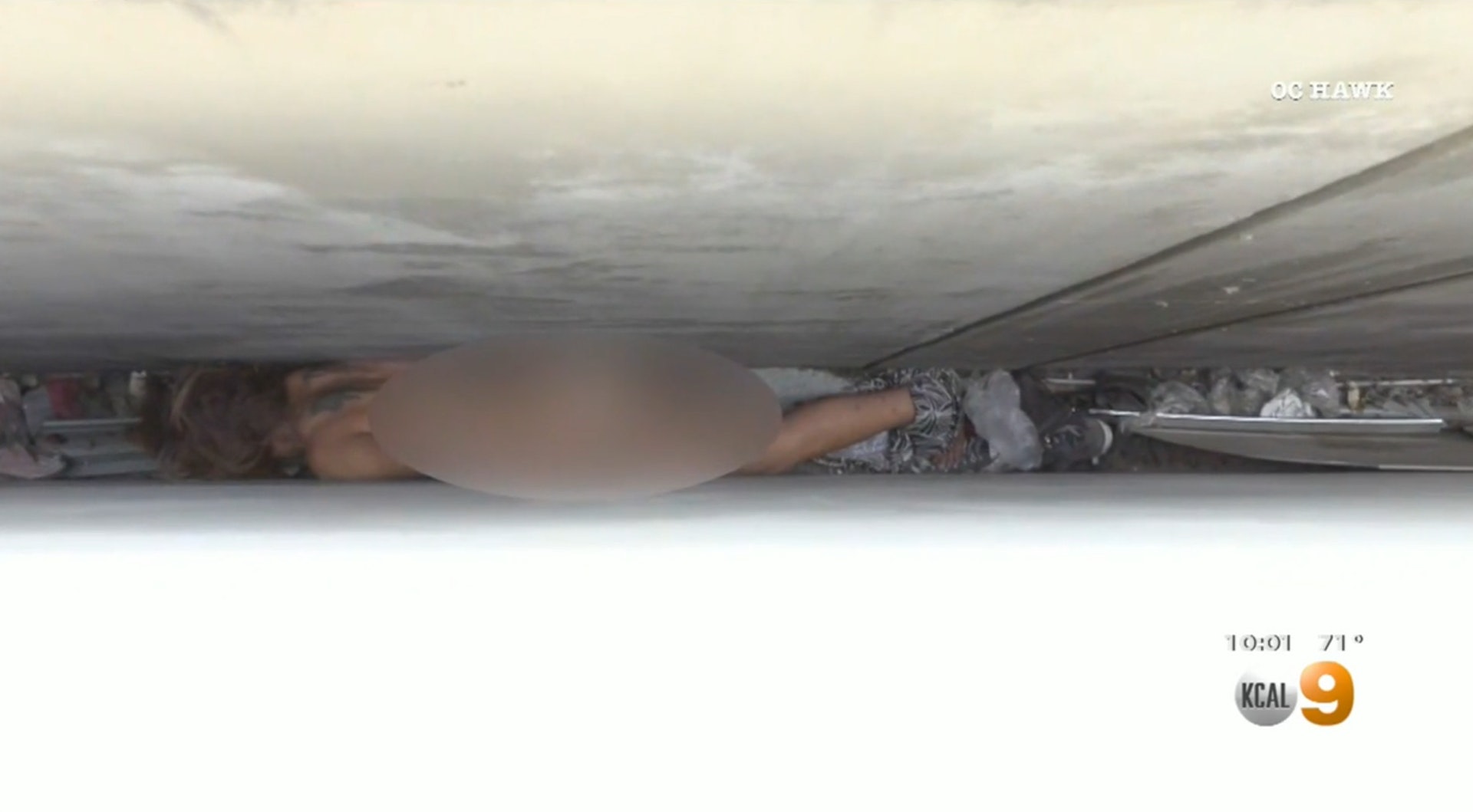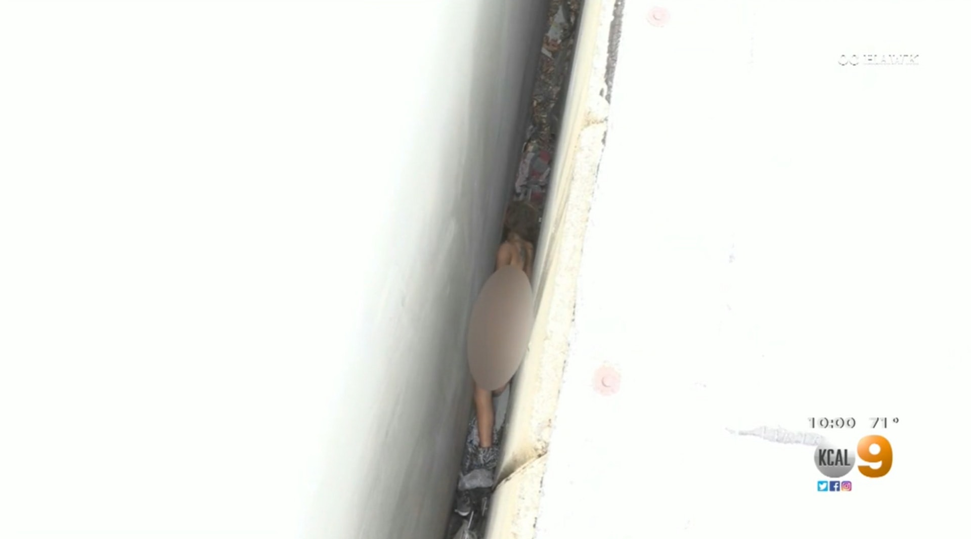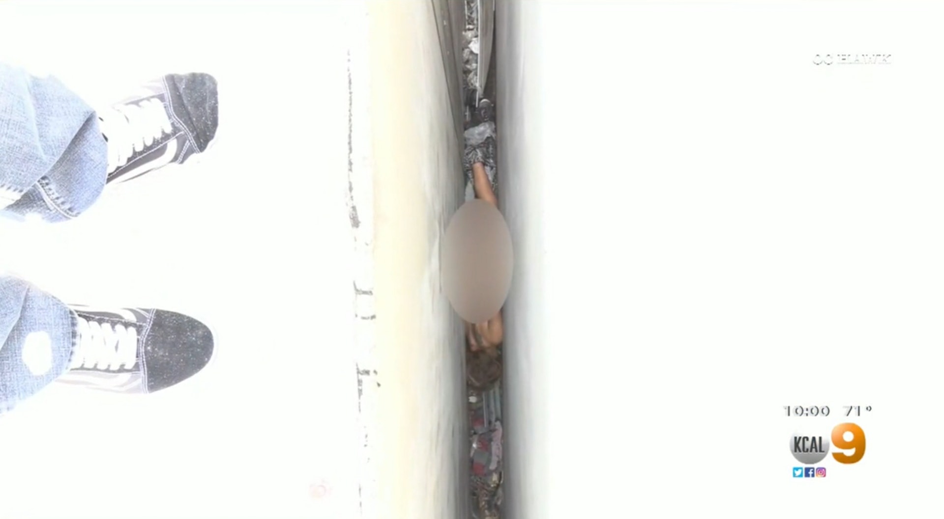 消防指女子卡入的窄縫只有約20厘米闊,她當時側身臉朝下,未有透露自己如何進去。(KCAL9新聞截圖)