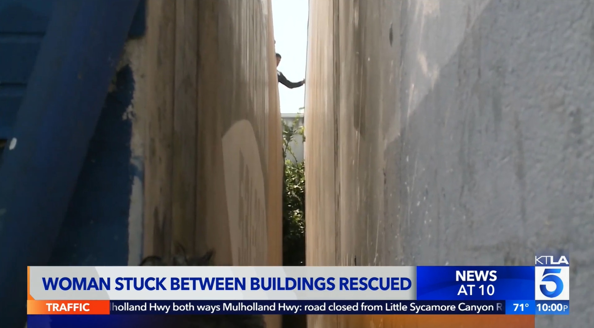 ' y& A y) E" y6 ]1 l' {2 ?兩幢大廈之間的窄縫竟然卡住1個人?美國加州日前有汽車維修店的人離奇聽到女子哭泣聲,維持接近半小時,找不出源頭下職員報警。警方最終爬上屋頂發現1名全裸女子側身卡在兩大廈中間僅約8吋闊(約20厘米)的窄縫,最終消防員到場鑿爆牆壁才成功救出女子。許多網民好奇女子為什麼會出現在窄縫內,消防指被困女子拒透露為什麼她會卡在窄縫,但消防猜測只有2種方法,一是自己從牆的邊緣爬入去,一是從屋頂跌落去。