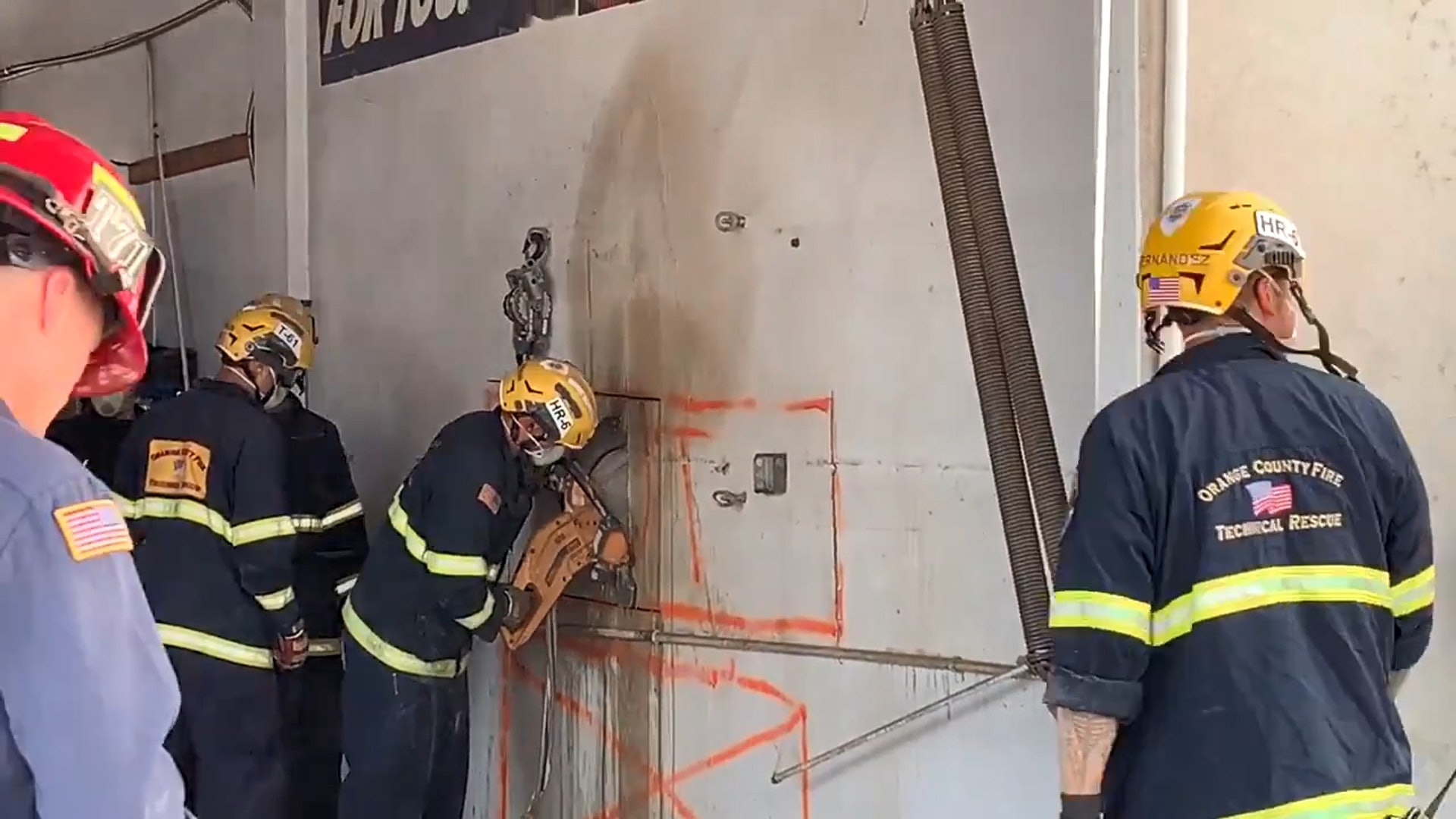 消防先在牆身鑿出1個洞,放入小相機後再評估如何切割。(「OCFA_PIO」Twitter影片截圖)