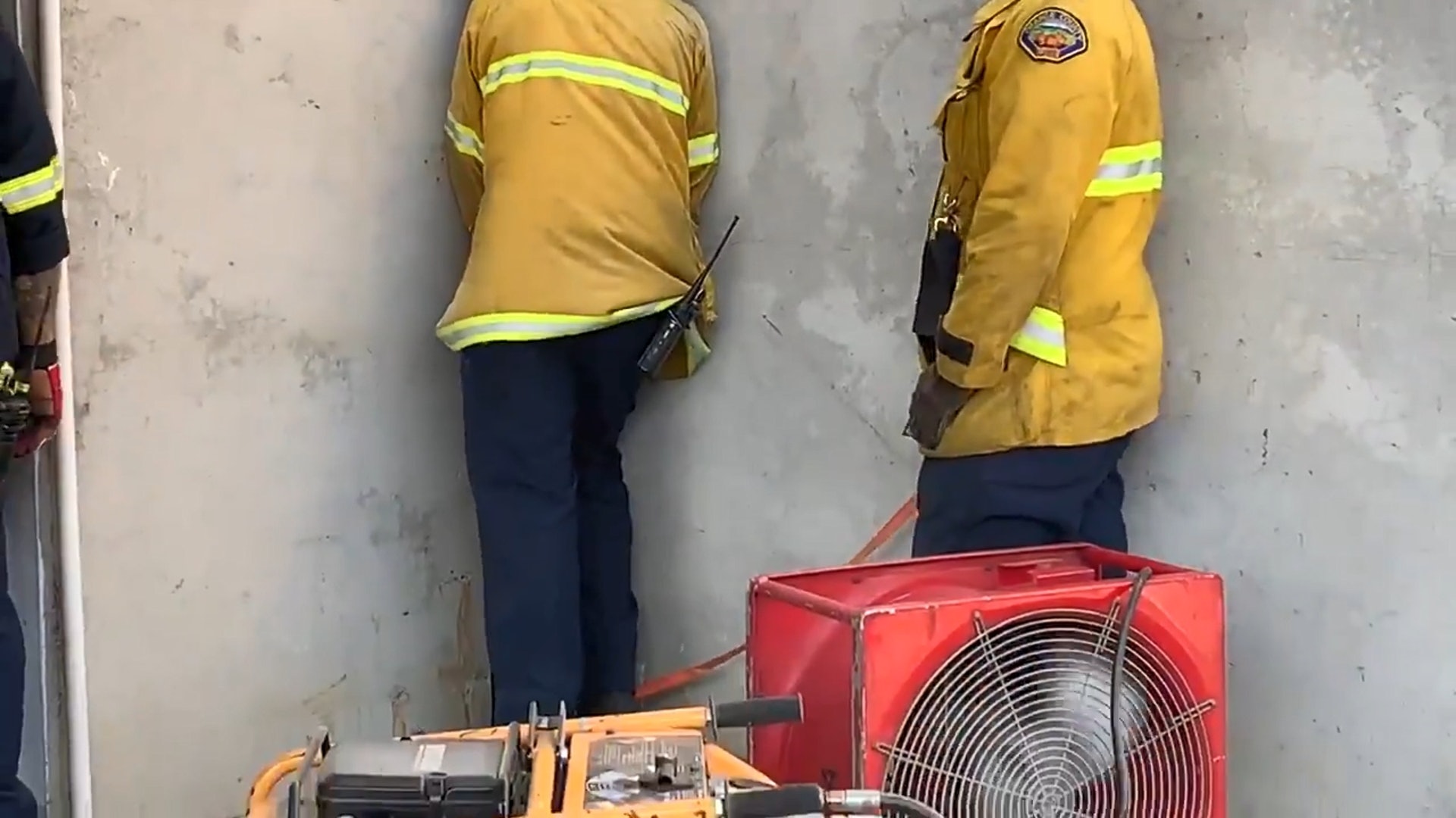 消防指女子卡入的窄縫只有約20厘米闊,她當時側身臉朝下,未有透露自己如何進去。(KCAL9新聞截圖)tvb now,tvbnow,bttvb: y3 O, |! I" L& M7 ]
