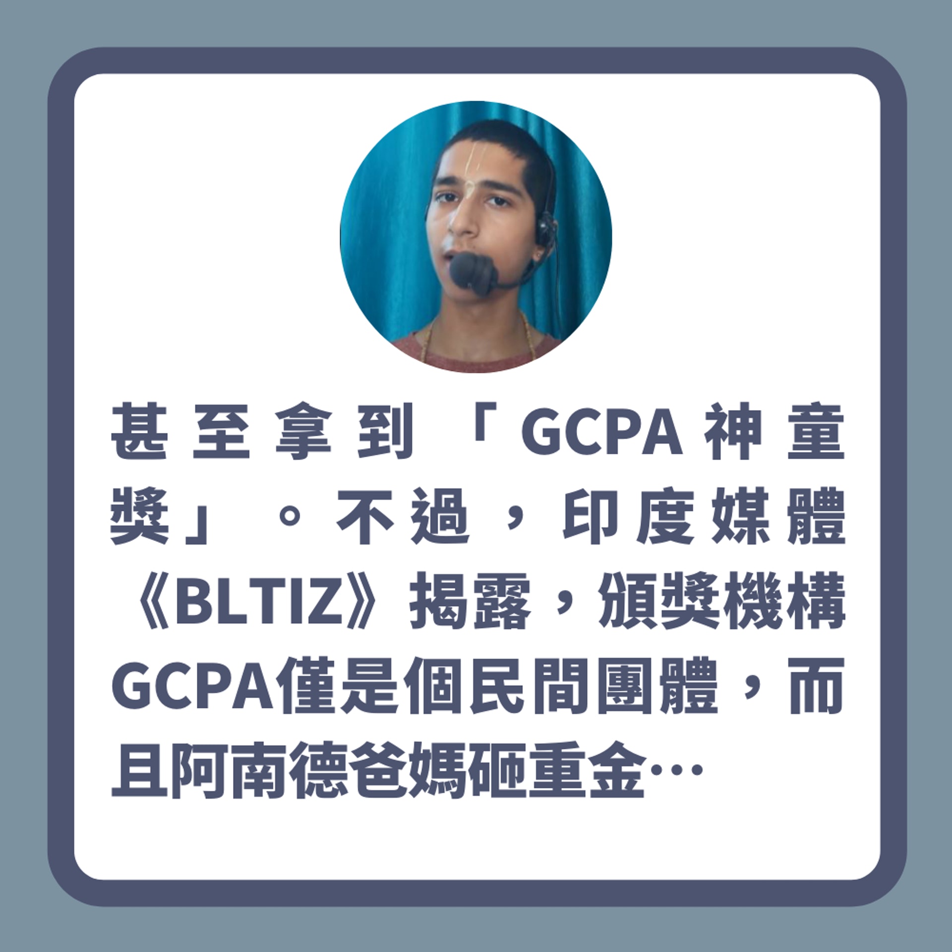 直到阿南德2020年一部預言疫情的影片,讓他瞬間走紅國際,甚至拿到「GCPA神童獎」。不過,印度媒體《BLTIZ》揭露,頒獎機構GCPA僅是個民間團體,而且阿南德爸媽砸重金在媒體宣傳,甚至買下廣告,安排暗樁來衝人氣,實際上阿南德一家全是騙子。 |