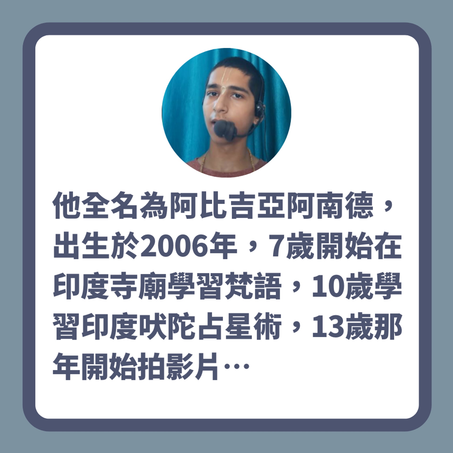 / @6 v' _/ g5 Y3 r7 }1 L# n多次預言成真的「印度神童」,到底是誰?他全名為阿比吉亞阿南德,出生於2006年,7歲開始在印度寺廟學習梵語,10歲學習印度吠陀占星術(Vedic Astrology),13歲那年開始拍影片並上傳YouTube,因一系列預言命中,讓他短短3年內,僅16歲年紀就已紅遍國際。
