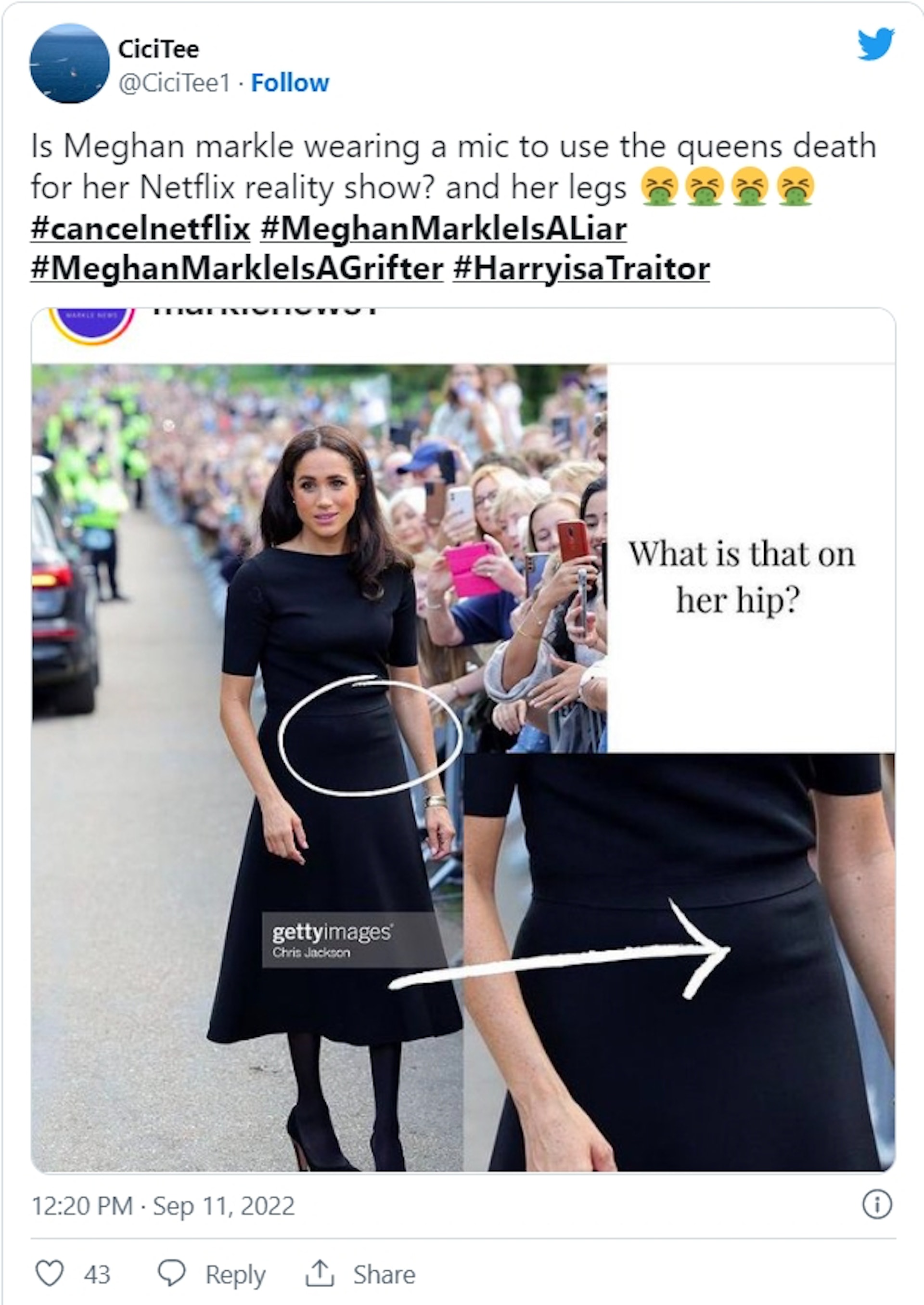 有人猜測,梅根當時戴着麥克風錄音設備,甚至推測她有可能是在為真人騷收集素材,「梅根戴著麥克風,是把女王的死用在她的Netflix真人騷上?」、「我不敢相信她居然在錄這個,邪惡又惡毒的女人,希望英王查理斯三世(Charles III,又譯作查爾斯三世)已經告訴哈里別讓梅根參加葬禮」。公仔箱論壇) ^0 r$ n1 ?$ U# p) U4 H8 U. B