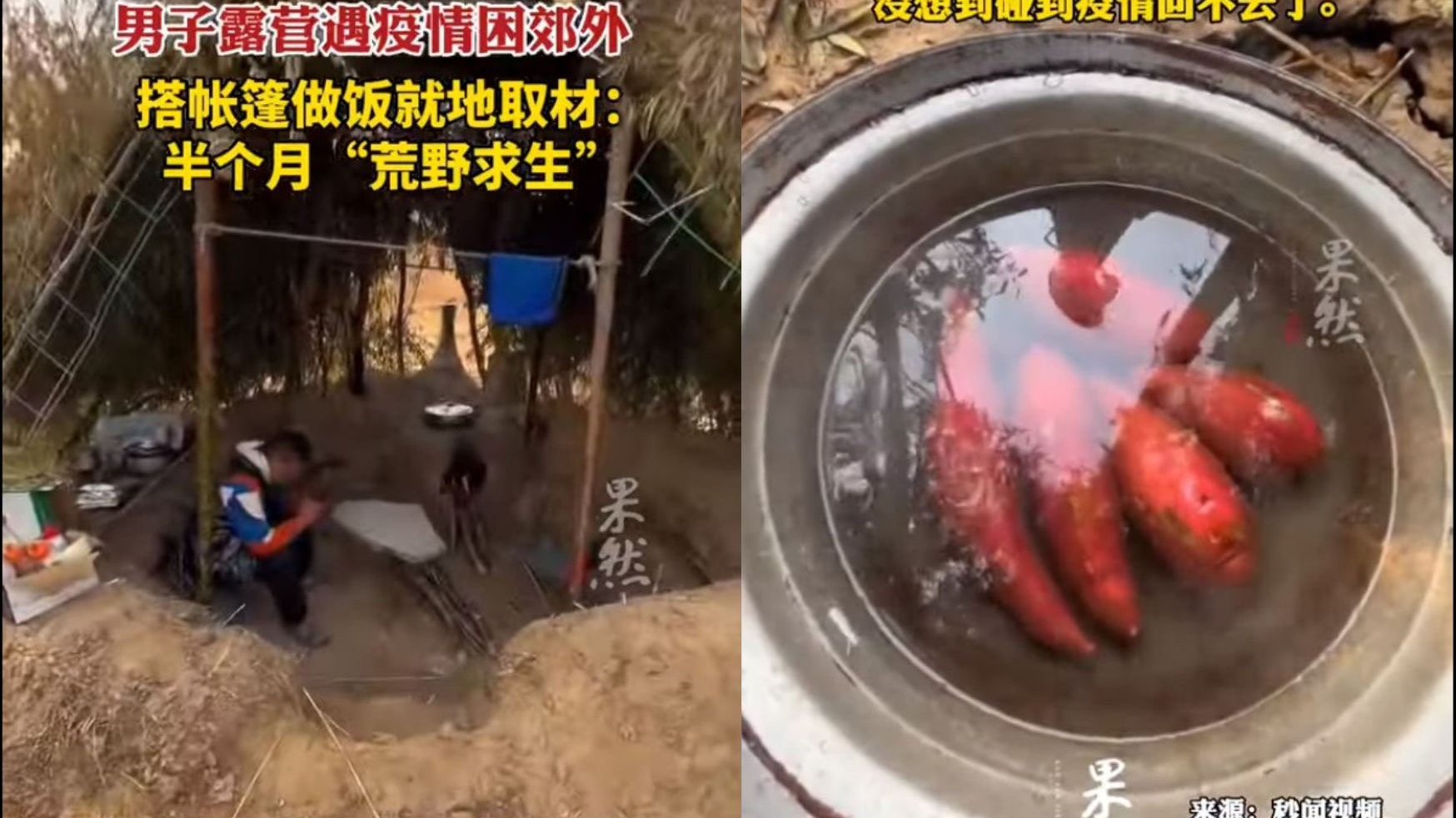 一行人在露營遇上封控滯,遂搭起帳篷繼續「荒野求生」。網上影片截圖4 }1 \9 U9 V a: E: a/ `' X$ f E( v