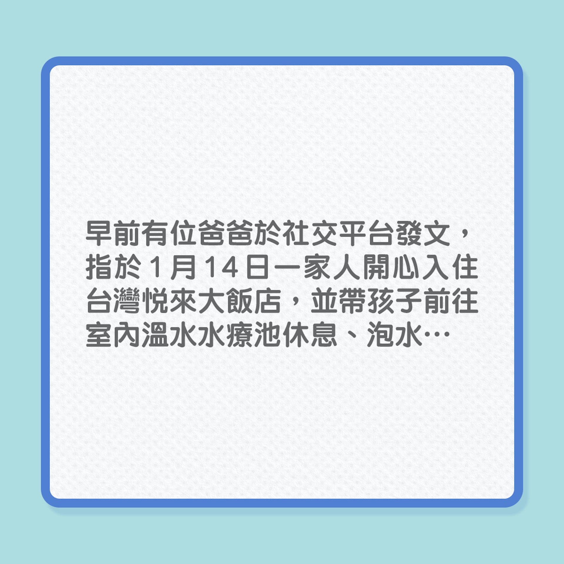 6 T( H' B4 F1 q c5.39.217.76一名張姓爸爸與家人於1月14日在台灣花蓮遠雄悅來大飯店室內水療池泡水,但池子底部的排水孔破裂,強勁水流將他往下拉,害他差點溺水,脫困後更發現臀部受傷有瘀青。酒店發聲明回應,對於水療池設施異常造成旅客受傷,致上最深歉意,並全面檢查水療池與泳池設備,目前水療池關閉中。