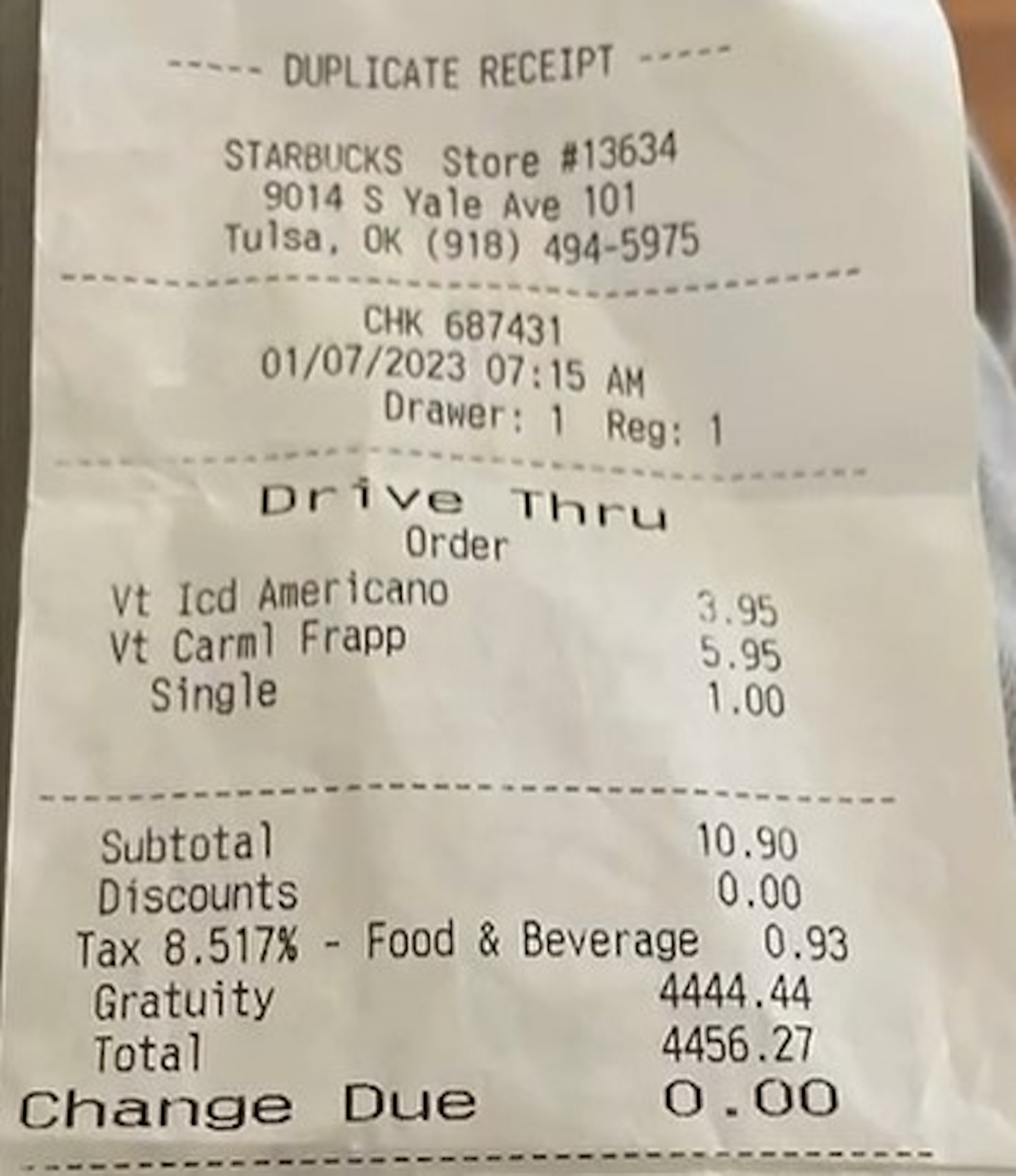 2 y" S: L6 Z* Q+ n& n% Q2杯咖啡合共11.83美元,但被收取了4,444.44美元小費,結果合共4,456.27美元。(「FOX」截圖)