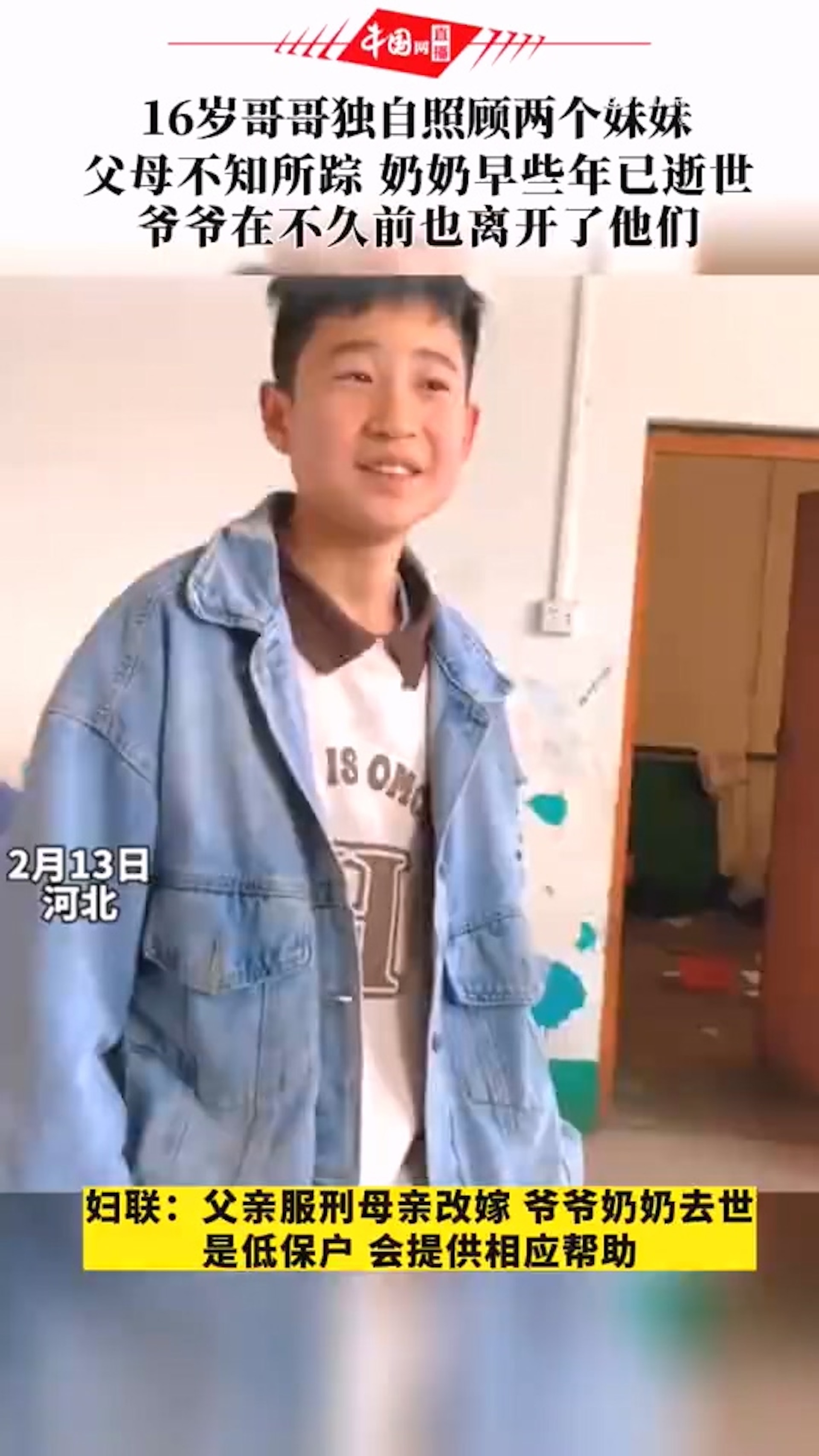 河北省邢台市一名16歲少年獨自照顧2個妹妹,因為雙親不知所蹤,爺爺、嫲嫲也相繼去世,只剩三兄妹相依為命。近日一段援助影片曝光後,引起廣泛關注。當地婦聯會介入關心後,證實小兄妹一家是低保戶,爸爸在外地坐牢、媽媽改嫁,後續將提供協助。TVBNOW 含有熱門話題,最新最快電視,軟體,遊戲,電影,動漫及日常生活及興趣交流等資訊。: Z1 c% @7 t/ a1 z( d