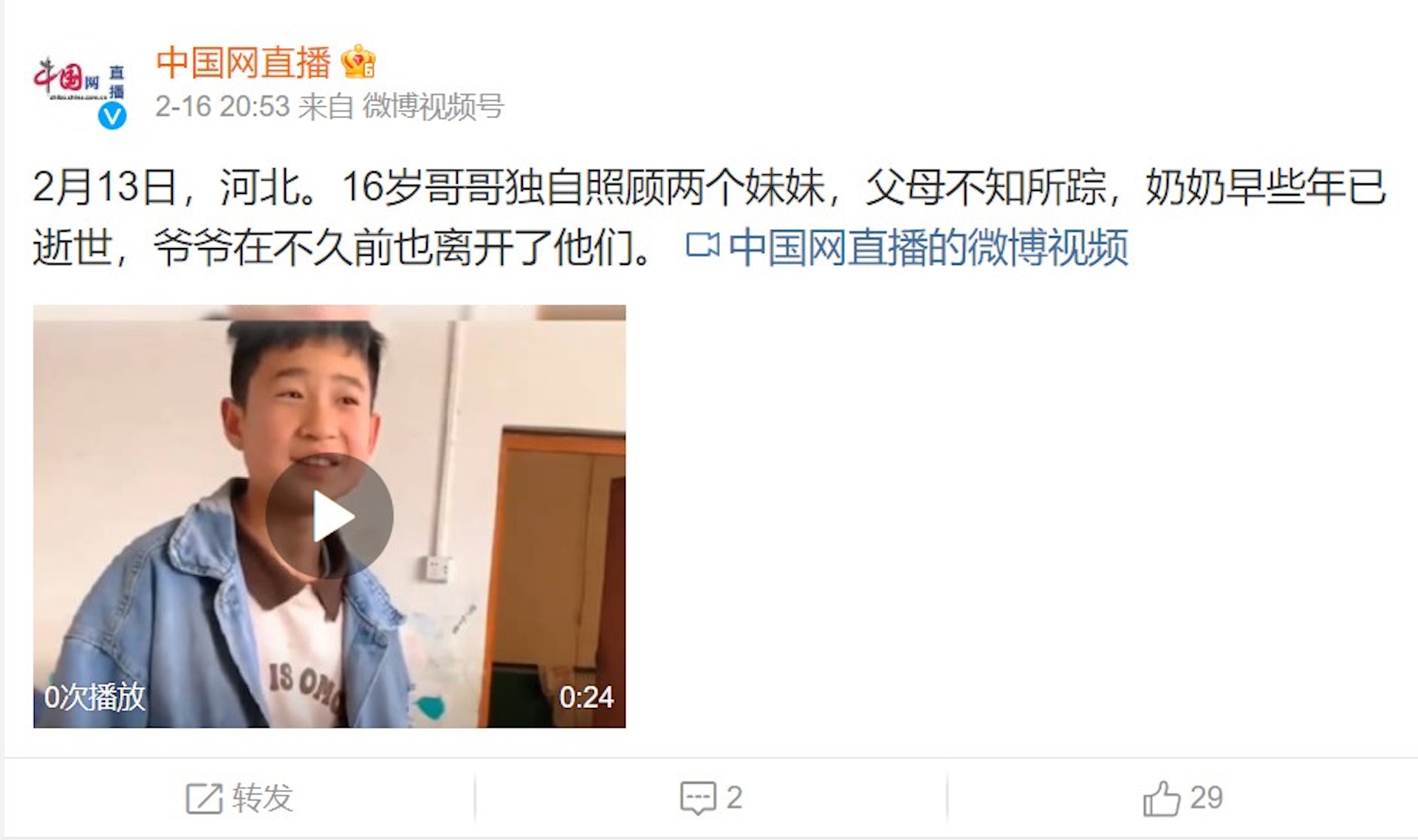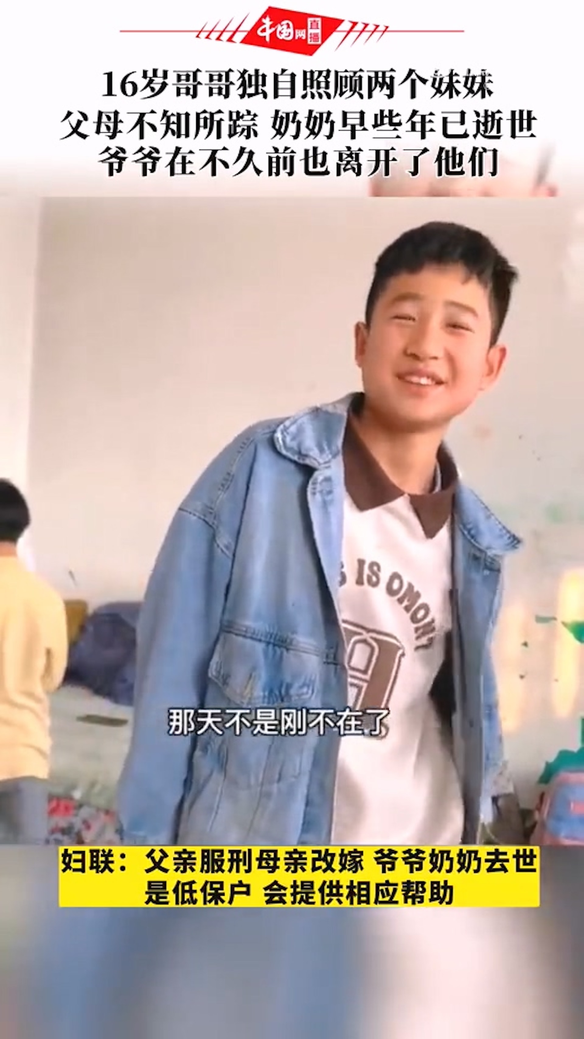 16歲男孩父母失蹤,爺爺更在不久前離世。他要獨力照顧2妹妹撑起一個家。(微博@中國網直播)