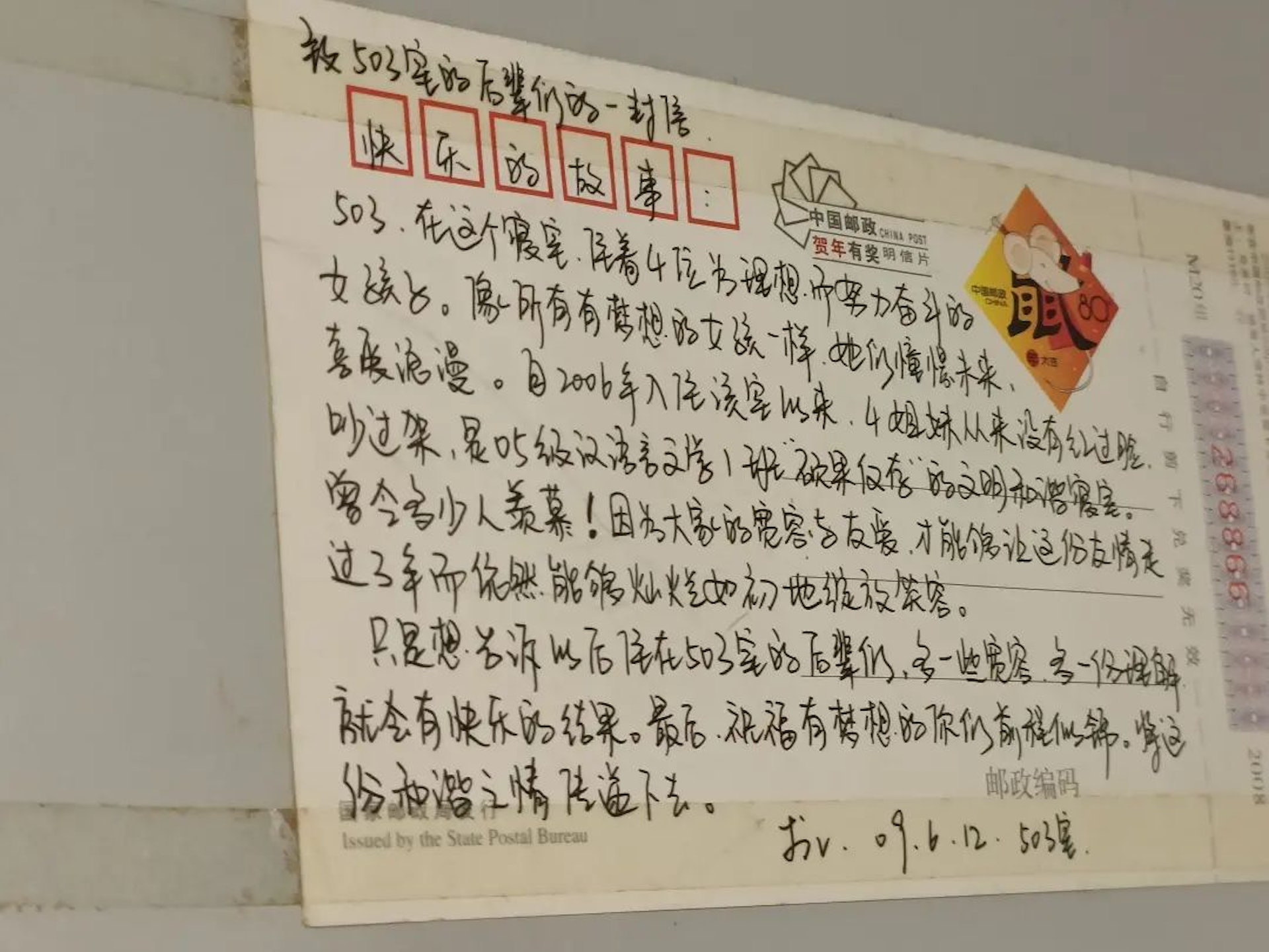 明信片落款時間為2009年6月12日,當中提到當年的503室住了4位為理想而努力奮鬥的女孩子,「像所有有夢想的女孩一樣,她們憧憬未來,喜愛浪漫。自2006年入住該室以來,四姐妹從來沒有紅過臉、吵過架,是05級漢語言文學1班『碩果僅存』的文明和諧寢室」、「只是想告訴以後住在503室的後輩們,多一些寬容,多一份理解,就會有快樂的結果」。0 ?9 c. v- p F" j( D) S