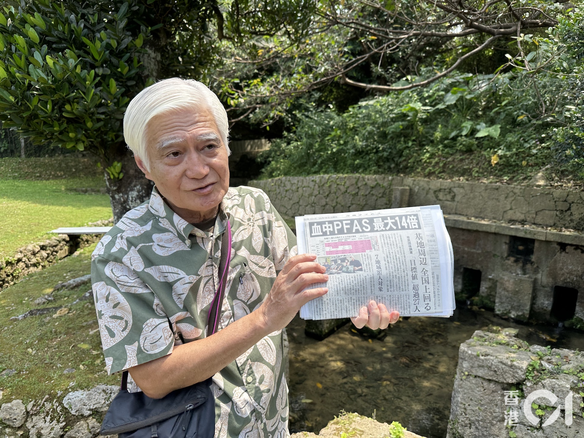 下一站我們前往當地知名的「喜友名泉」,在鐵絲網圍籬後面,等着我們的是已白髮蒼蒼「宜野灣美水會」照屋正史先生。豔陽下我們站在潺潺流水源頭,照屋先生拿起一疊厚厚的自製資料,娓娓道來當地水源都已受到普天間基地軍用化學物品的污染,特別是滅火泡沫藥劑含有的PFAS(全氟/多氟烷基物質)與PFOS(全氟辛烷磺酸),由於屬於持久性化學物質,其不易降解,且會在環境、食物鏈和人體中持續累積毒性,因此在美國、歐盟、台灣等地都已嚴格禁用。