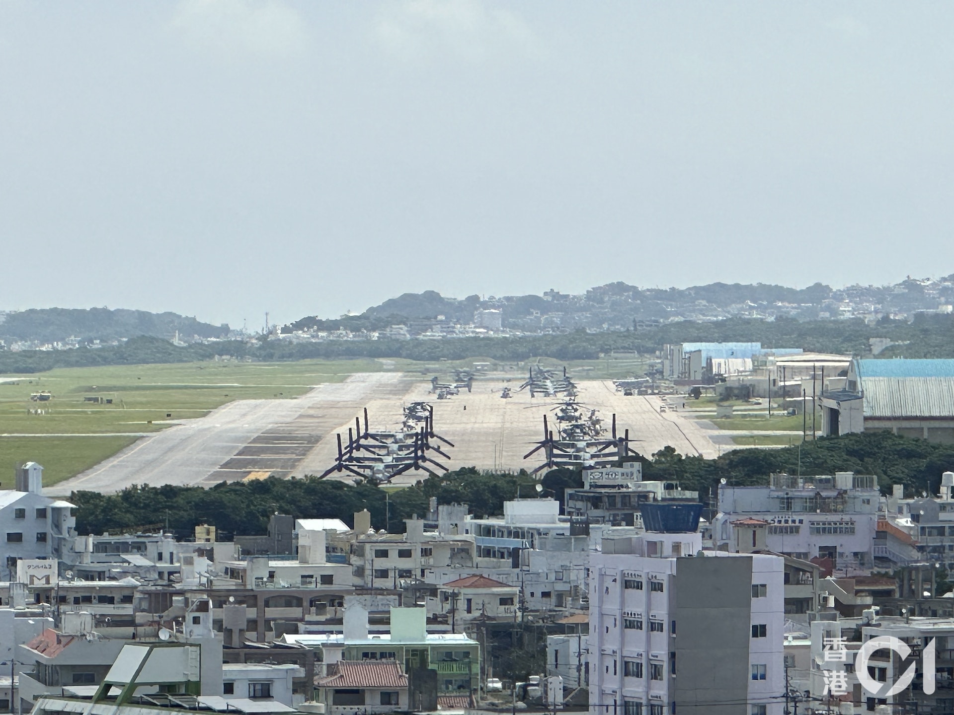 接着我們把視線往右遠眺,映入眼簾的是爭議極大的「普天間」美軍基地。長嶺女士表示,普天間被稱為「世界最危險的機場」,周圍遍布多所大中小學校,而長達2,800公尺的跑道前後,按法規不能住人,卻仍然形成了密集的住宅區。2004年美軍直升機墜落到鄰近的沖繩國際大學,2017年美軍直升機窗戶從空中掉落普天間第二小學,2020年又發生消防滅火泡沫劑外洩事故。不停發生的意外,讓居民不斷要求遷移普天間機場,將土地「返還於民」。長嶺女士舉着報紙無奈地對我們解說,普天間問題50年來都沒有改變。