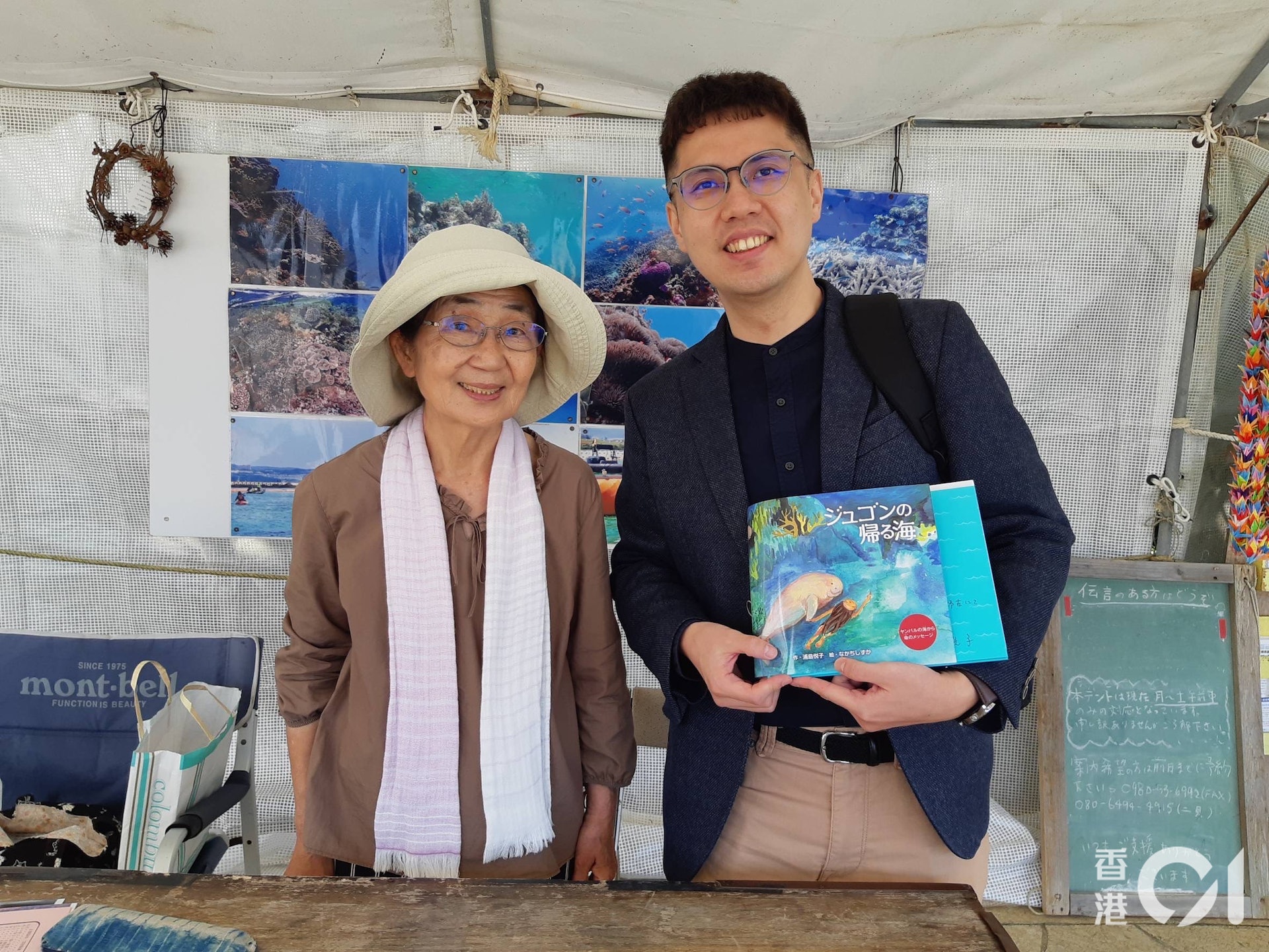 8 U% f8 c( H0 v0 w5 M! E6 e5.39.217.76《香港01》駐台首席記者張鈞凱(右)持《儒艮回歸大海》繪本,與「邊野古新基地」抗爭者浦島悦子女士(左)合影。(張智琦提供)