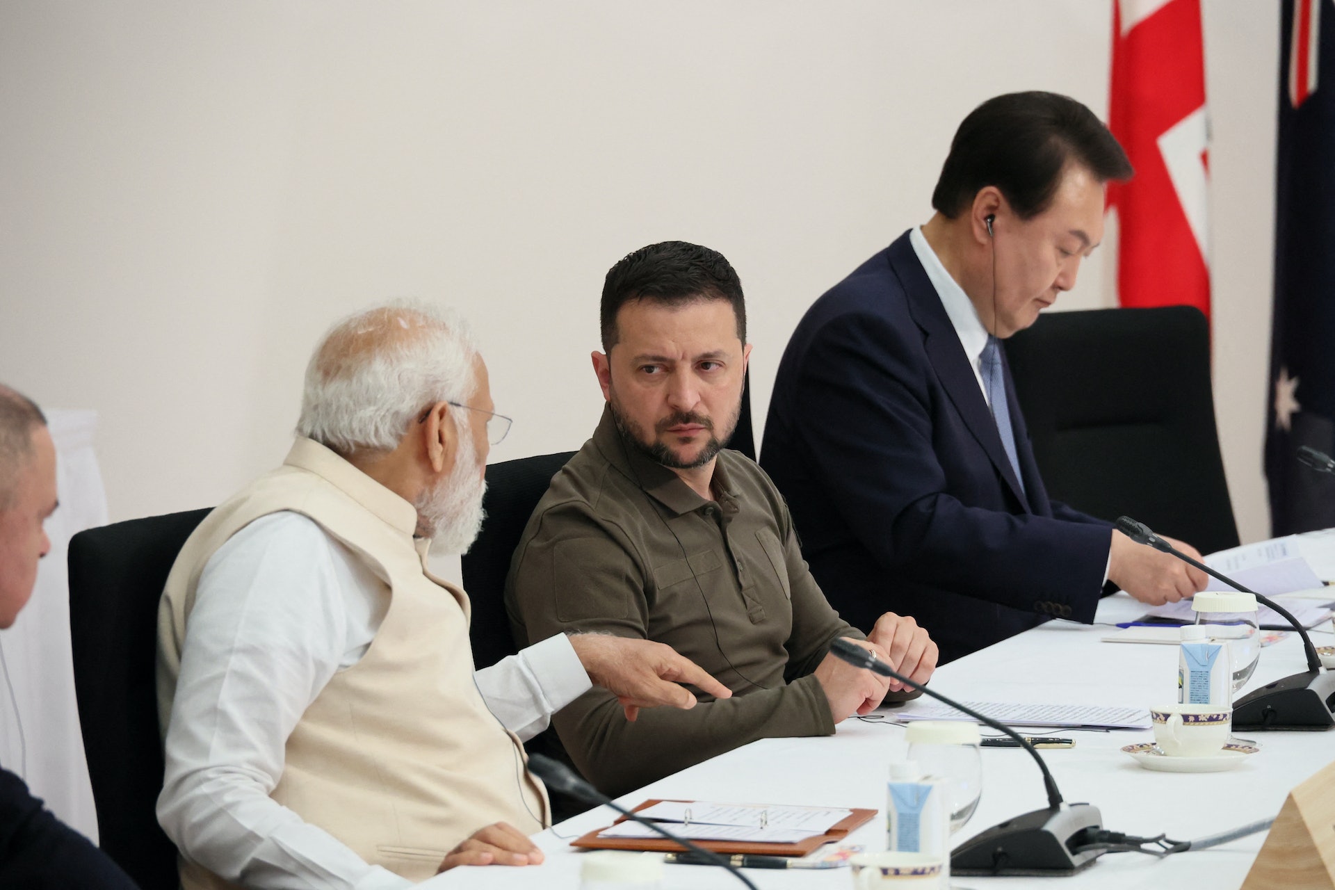 7 e5 [6 t! T/ b6 o5 W在日本廣島G7領導人峰會上,印度總理莫迪與身旁的烏克蘭總統澤倫斯基談話。(Reuters)