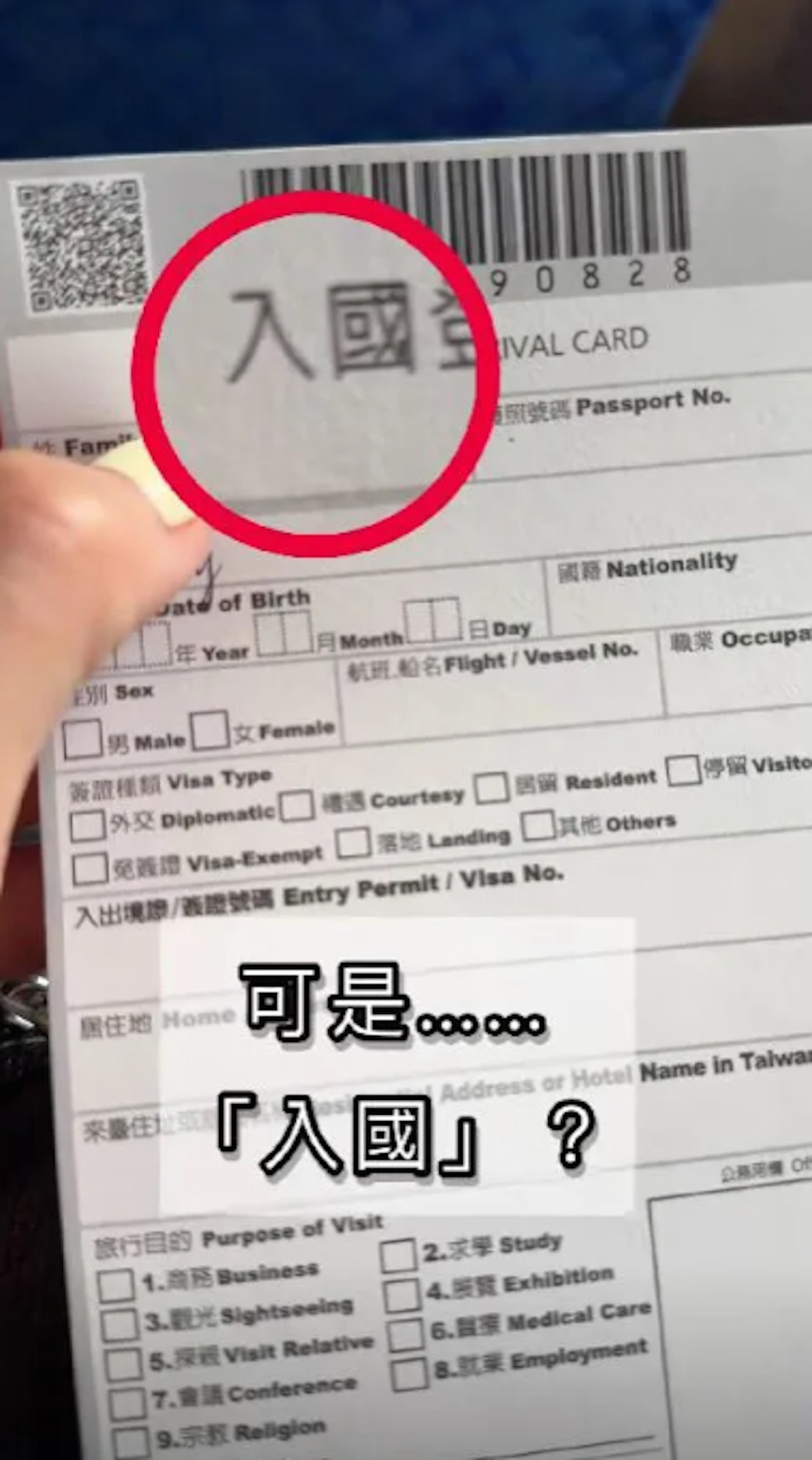 她表示,看到登記表上「入國」兩字,讓她氣到直接撕毀表格。(翻攝抖音)+ g" H2 o0 ?1 l# @$ T0 S