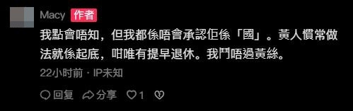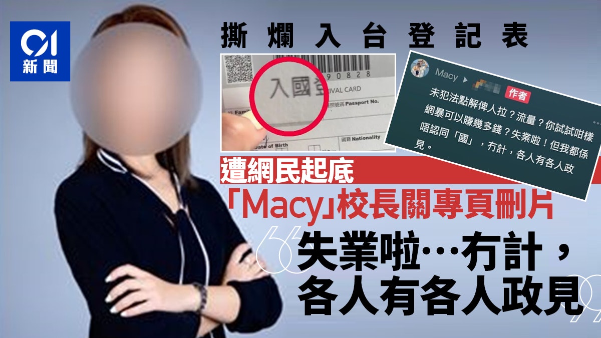 報道指,對於輿論質疑,Macy也回應,稱覺得做法欠妥的,並承認自己衝動了。但她強調自己沒有說謊,更不靠抖音博流量,也從來不要做網紅,自己拍抖音幾年,一直純分享,沒有賺過錢。她也在回覆中提及「失業啦」,又指自己鬥不過黃絲,「唯有提早退休」,但就堅持撕台灣「入國登記表」的行為沒有錯,「冇計,各人有各人政見」。