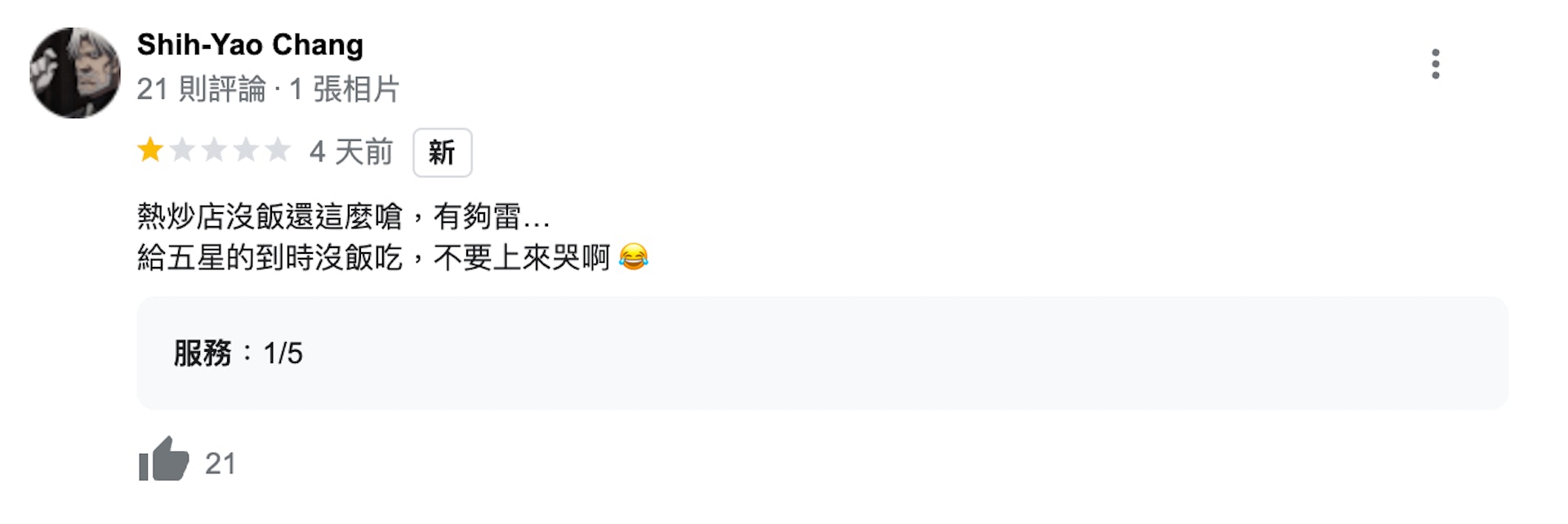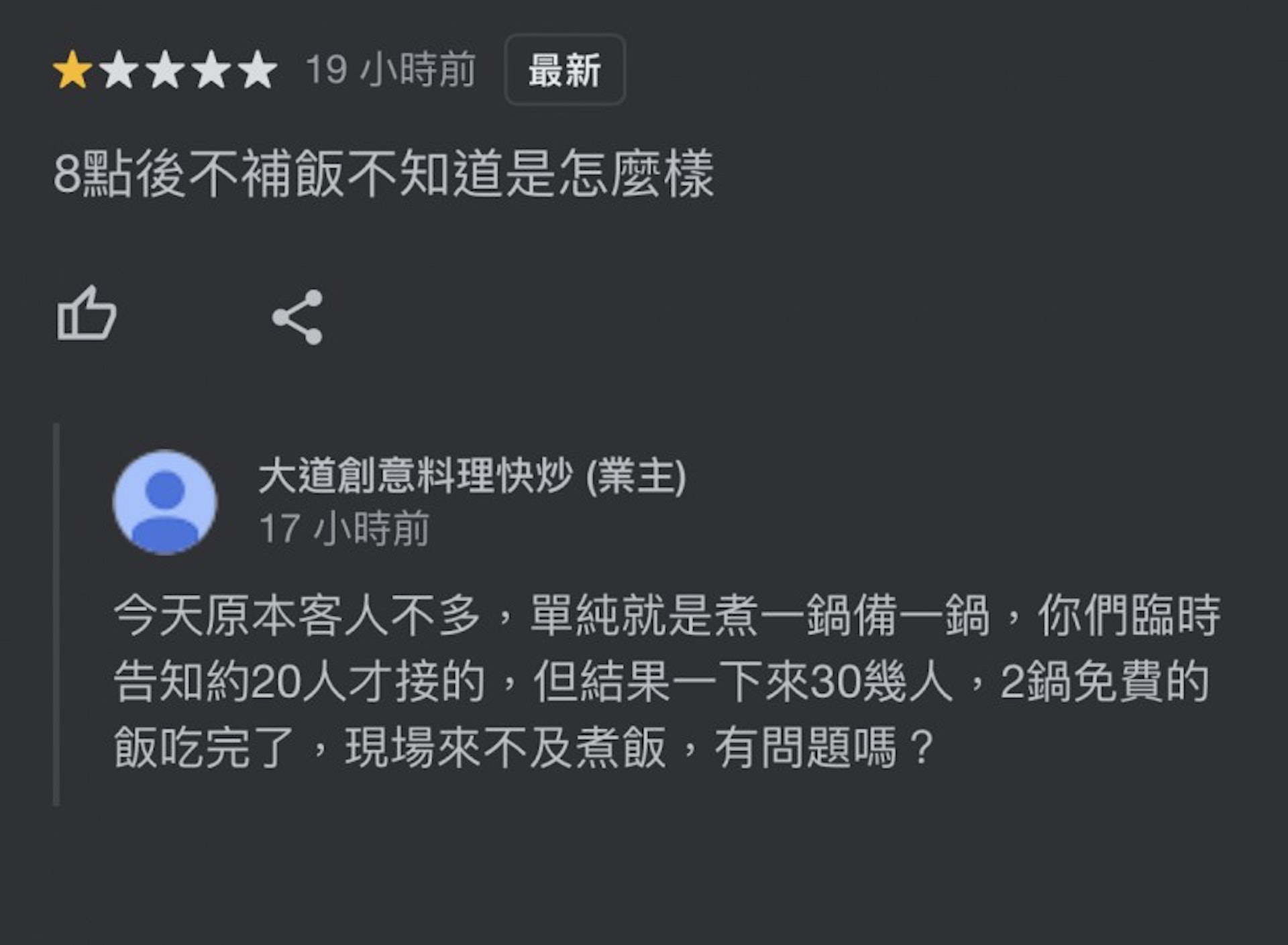 白飯之亂學生和店家的爭議。(大道創意料理熱炒google評論)