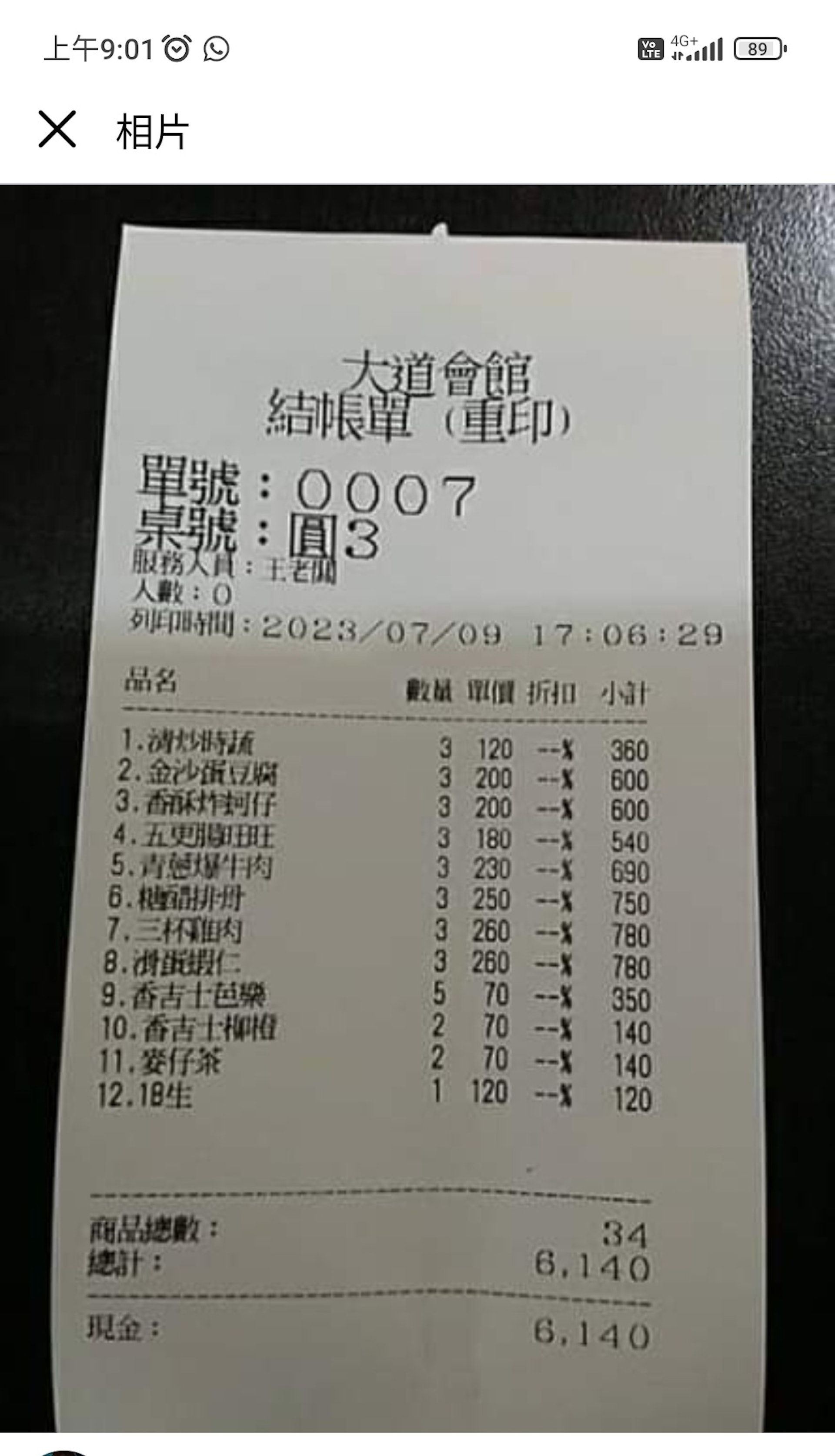 & L! u- i1 U1 \' `涉事收據。(大道創意料理熱炒)