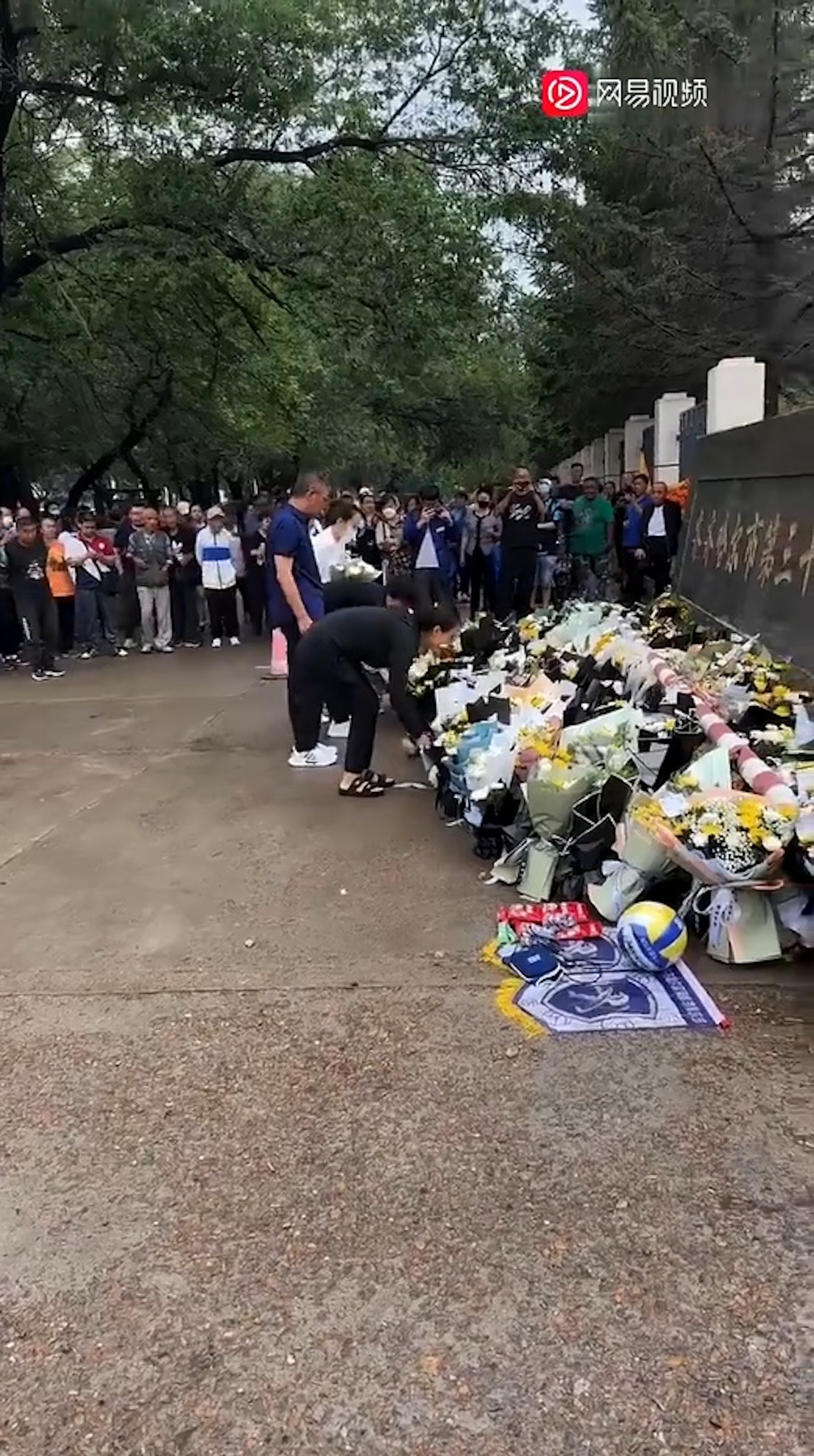 * G! _# t( o, e% S公仔箱論壇市民自發到校門外擺放鮮花掉念。(影片截圖)+ ]# I/ ~/ m) }2 v ~1 C( ~1 B