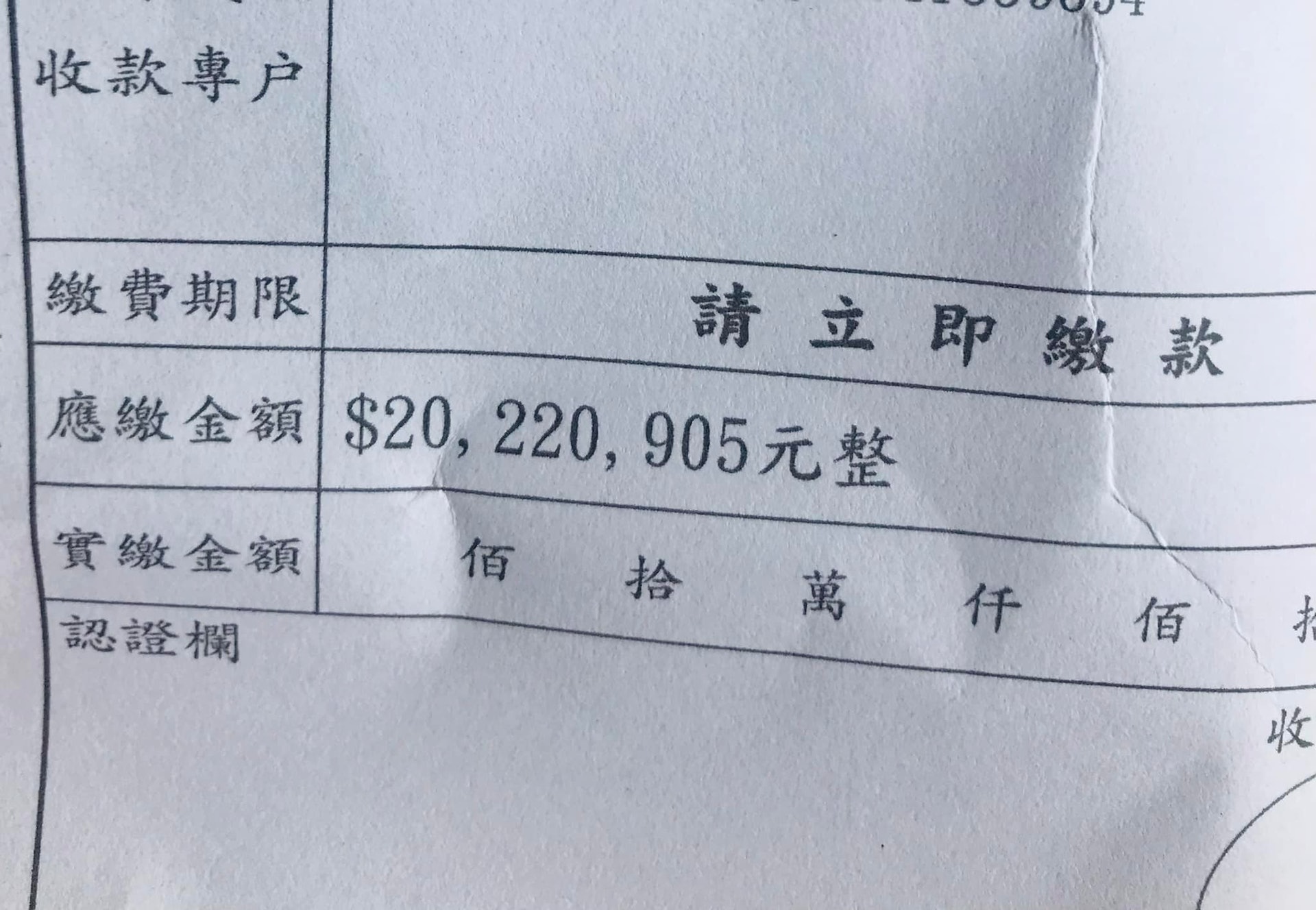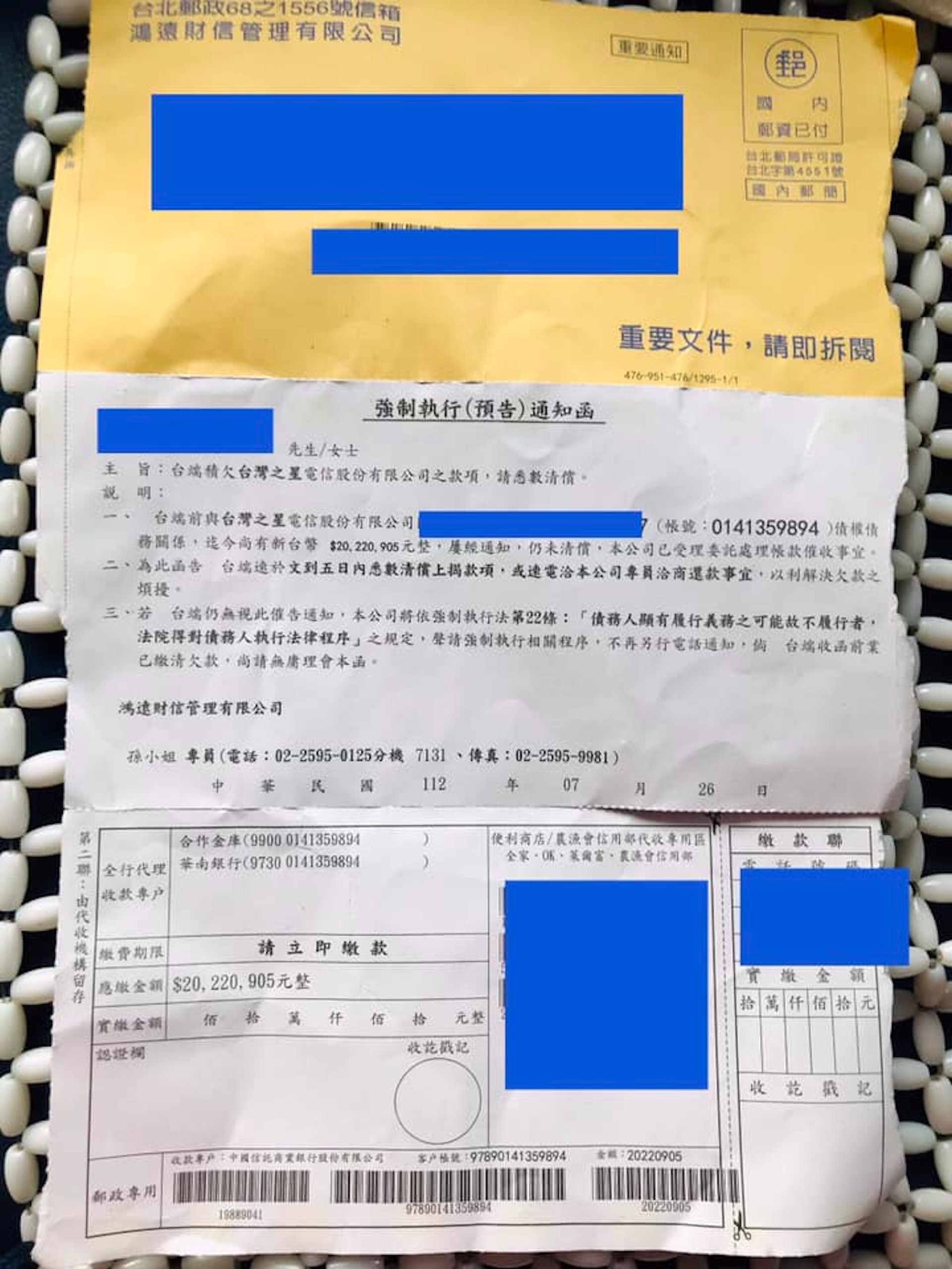 ) \1 h/ m5 Y& X+ Q: H& X1 K5.39.217.76從賬單見到,抬頭寫明是「強制執行(預告)通知函」,而應繳金額高達20,220,905新台幣(約560萬港元),繳費期限是「請立即繳款」。信件更列明,如事主無視通知,會強制執行法律程序,不再另行通知。