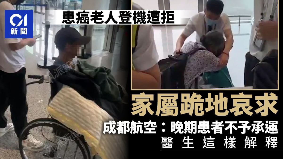 癌症老人登機被拒,運營航司為成都航空。(影片截圖)0 d' ^5 K0 H! A( d, o- X
