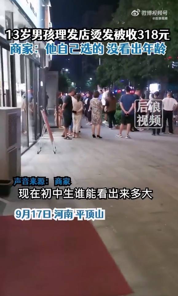 : z: q) q% E( L3 L內地河南1名13歲男孩獨自到理髮店,花費318人民幣(約350港元)燙髮(電髮),詎料父母得悉後不滿,認為理髮店收費太貴,報警要求全額退款。(影片截圖)公仔箱論壇: o9 s- D: `, w) [$ Y