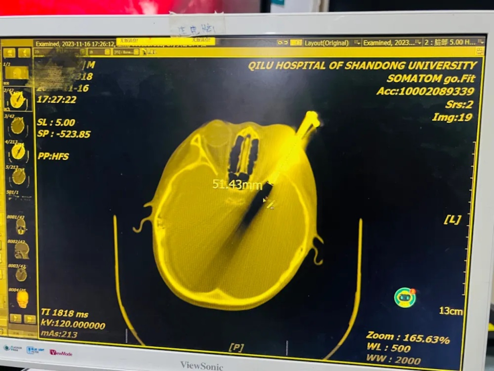 ( n- ~7 h0 m1 r- o據聰聰的顱內CT顯示,異物刺進了顱內,但沒有顱內出血等情況。急診科會同眼科、神經外科等會診,考慮到直接將鎖匙拔出很可能會引發顱內出血等問題危及生命,最終決定為聰聰實施開顱手術,取出異物。