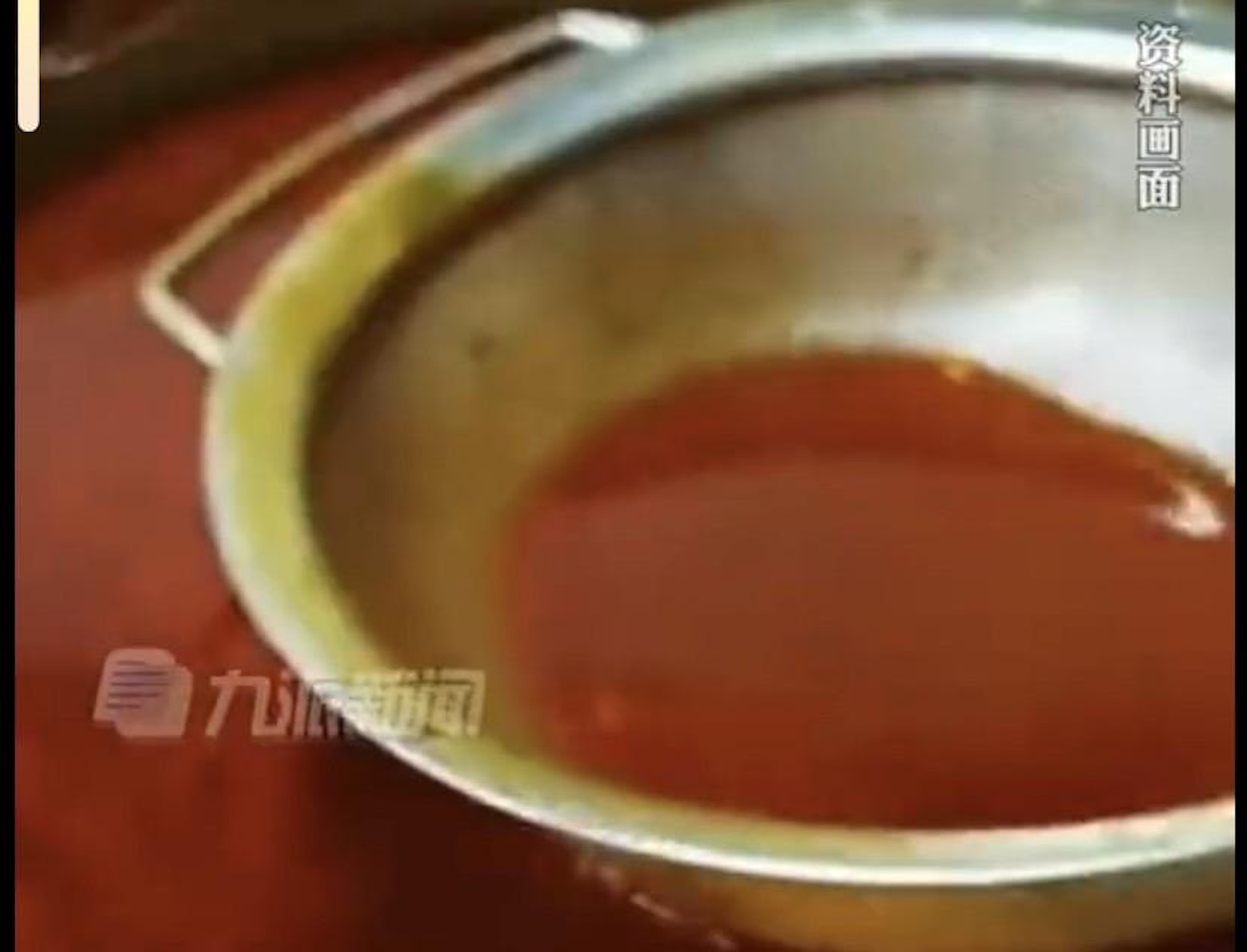 2020年,廣州海珠區一間火鍋店被揭發,回收顧客吃剩的青菜等食材再次出售,甚至連湯底紅油,都會經簡單隔渣過濾後重覆使用。圖為「口水油」製作過程:隔渣後,繼而就再用紗網作簡單過濾。(影片聲圖)