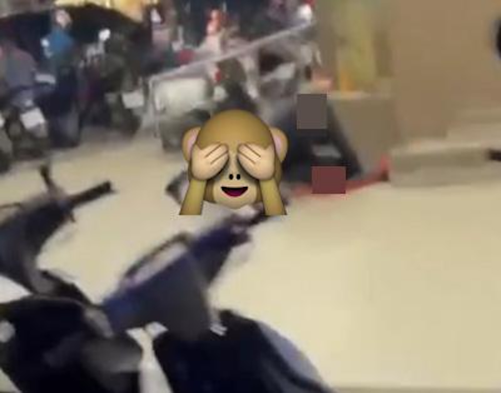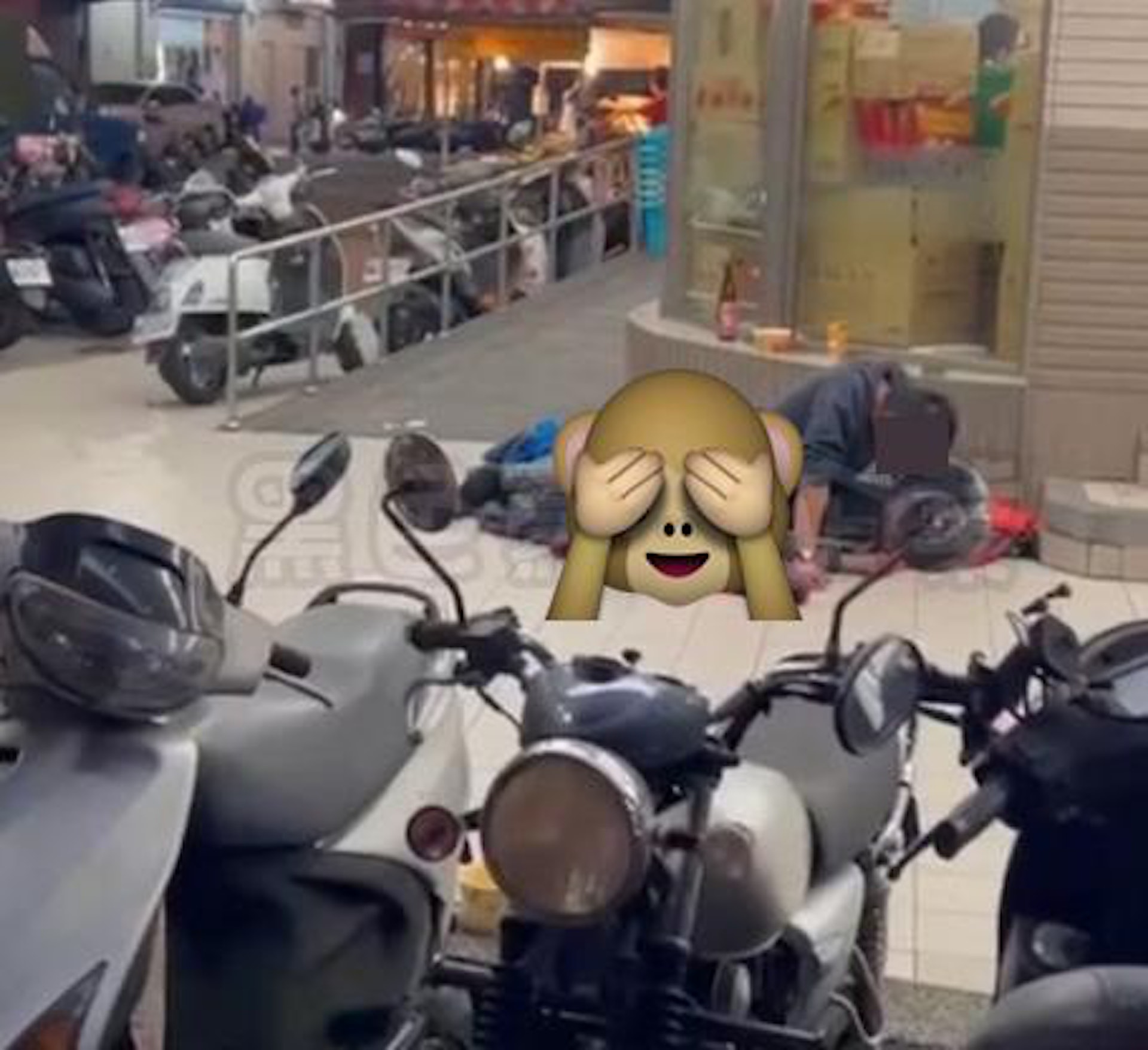 1 n% x! a4 V6 v" s P. a影片見到,便利店門口有2名男子裸露下半身、前後趴臥交疊在地上,偶有動作,疑似在進行性行為。(影片截圖). C5 x% a: Q0 G( s