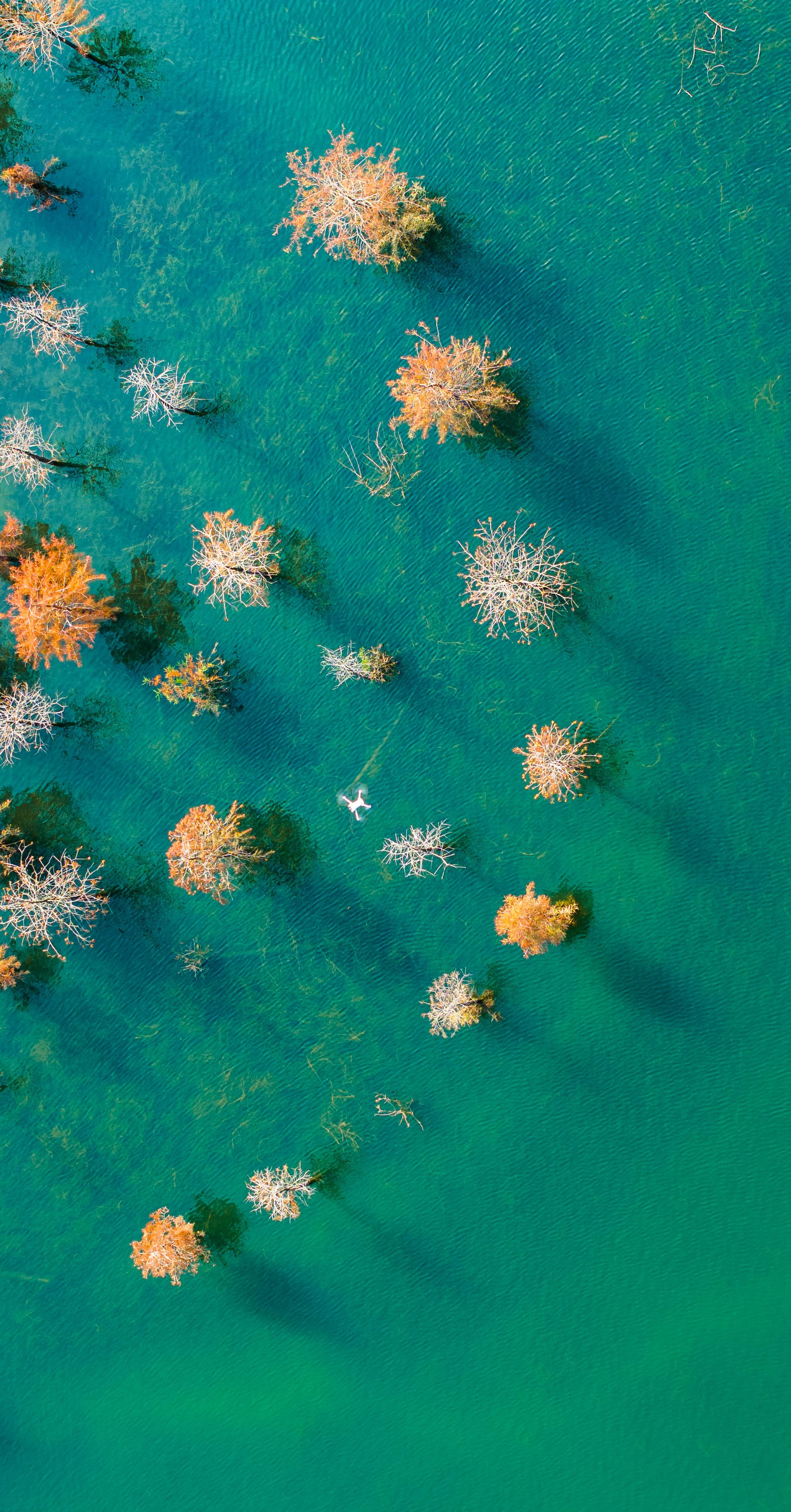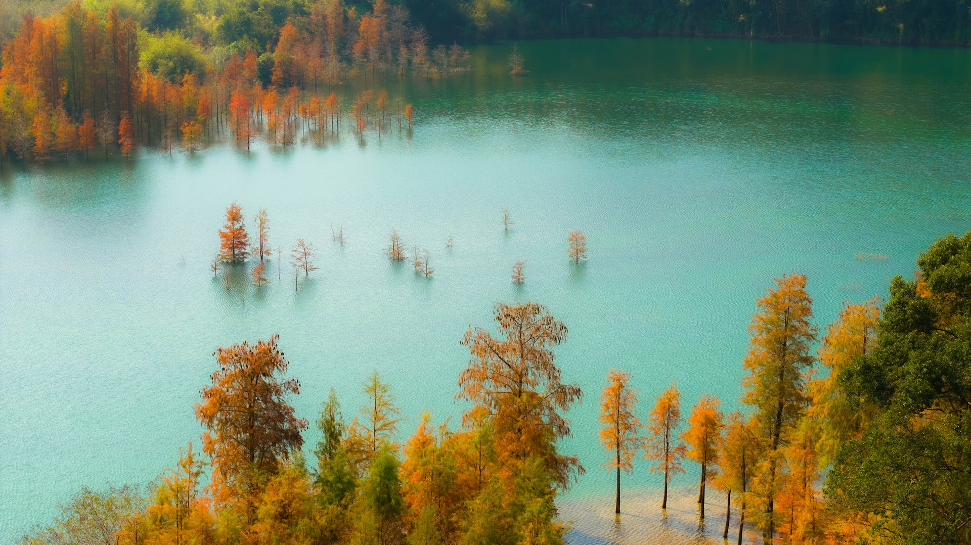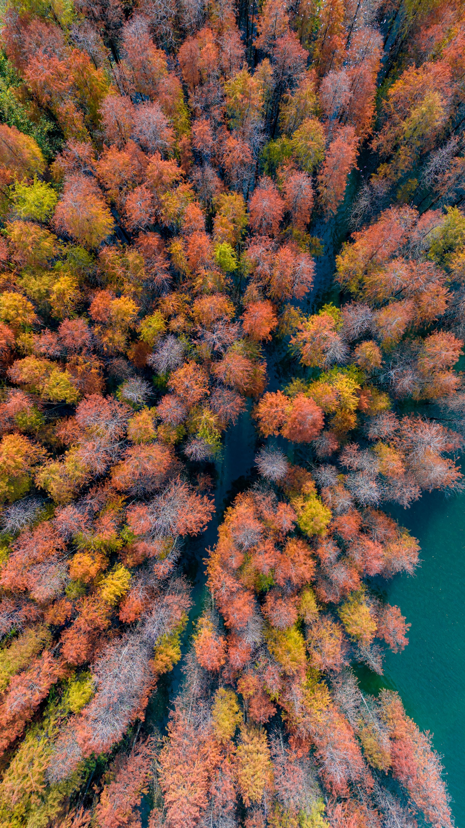 從空中俯瞰,大自然在這裏把所有色彩都運用得恰到好處,漫山彩林呈現出五彩繽紛的旖旎風光。空拍視角下的落葉杉宛如一朵朵綻放的鮮花,與藍天碧水相映成趣,青、黃、橙、紅等交織爭艷,恰似人間仙境。