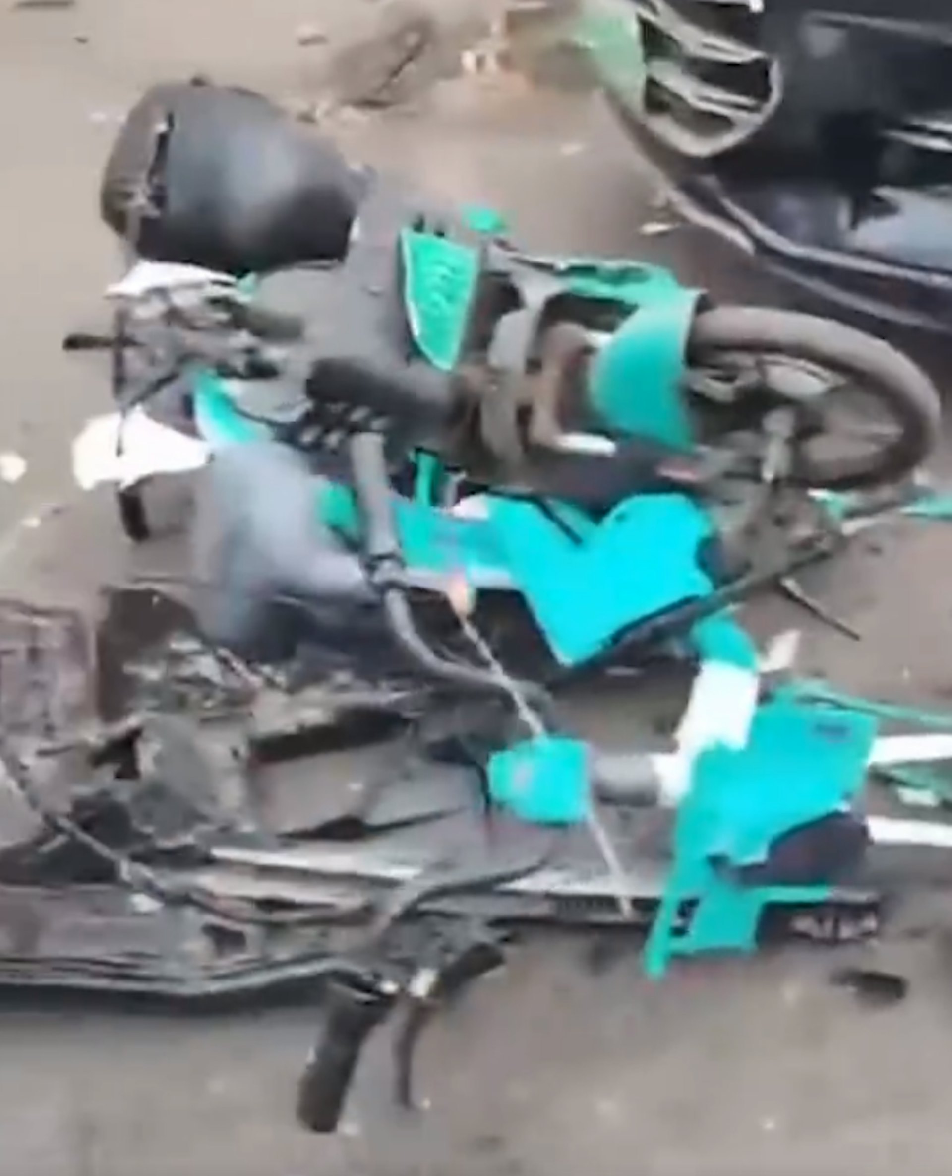 ; [- z7 `! W+ }4 k電動單車被撞成碎片。(影片截圖)
