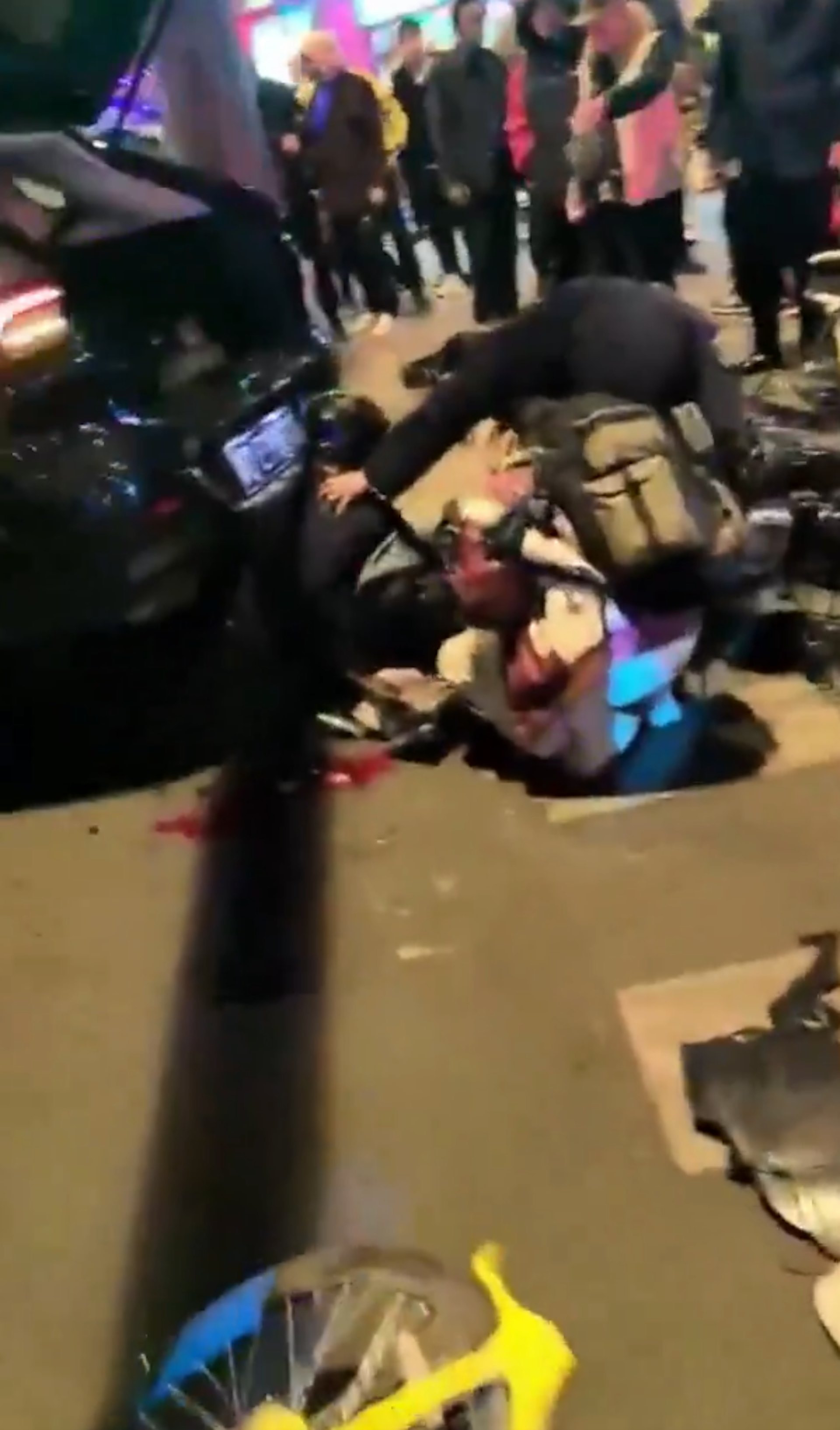 北京一輛私家車衝撞多輛電動單車,造成多人受傷。(影片截圖)公仔箱論壇! C6 Z2 K1 K8 m( N6 v% t: _& B: r6 N