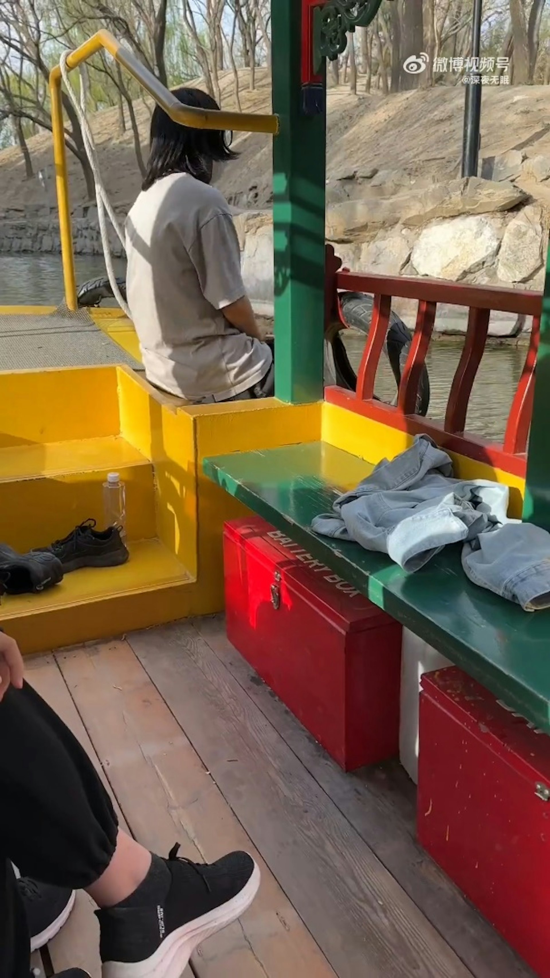 6 G9 g8 n3 [4 {7 ^公仔箱論壇在北京圓明園,一名穿灰色衣服的女生坐在船頭,將雙腳伸入湖中浸泡。(影片截圖)