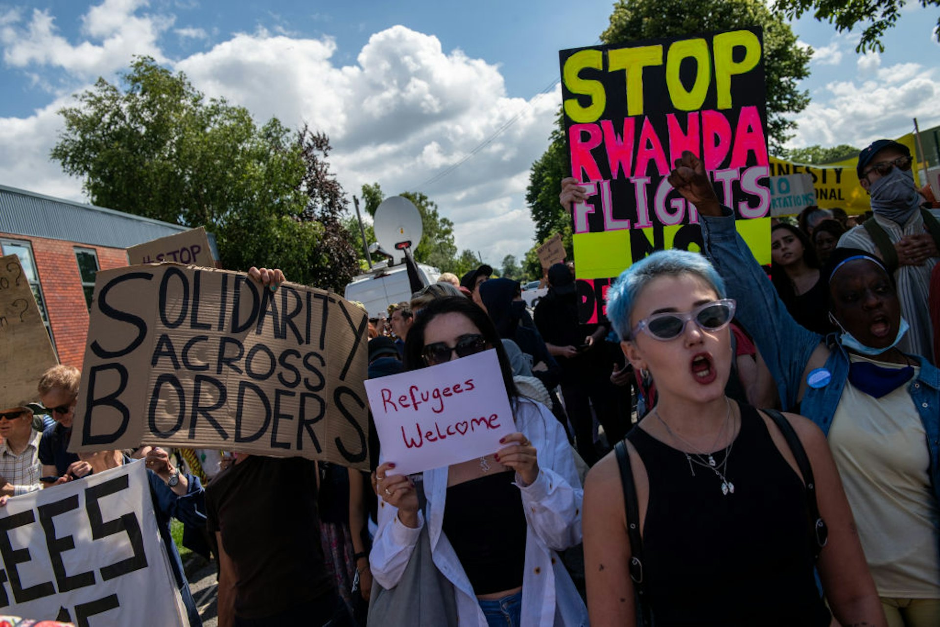 3 \3 _% h4 E1 J- E! G: m* O5.39.217.76圖為2022年6月12日,抗議者在英國倫敦一個移民遣送中心附近高呼並舉着標語牌,抗議英國將尋求庇護者遣送到盧旺達。(Getty)7 w6 X+ G, O2 y, U' D