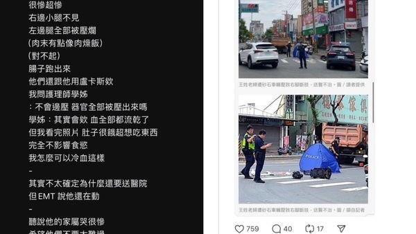 台灣高雄市本月1日發生砂石車撞擊電動輔助車事故,導致一名婦人捲入車底遭輾,送往高雄醫學大學附設中和紀念醫院(高醫)搶救後仍不治。然而,事後驚傳院內工讀生在社群平台Threads上發文,指老婦人「左邊腿全部被壓爛,肉末有點像肉燥飯」,貼文一出引台灣輿論譁然。目前院方已對該名工讀生暫時停職,並發表聲明向死者家屬、社會大眾致歉。