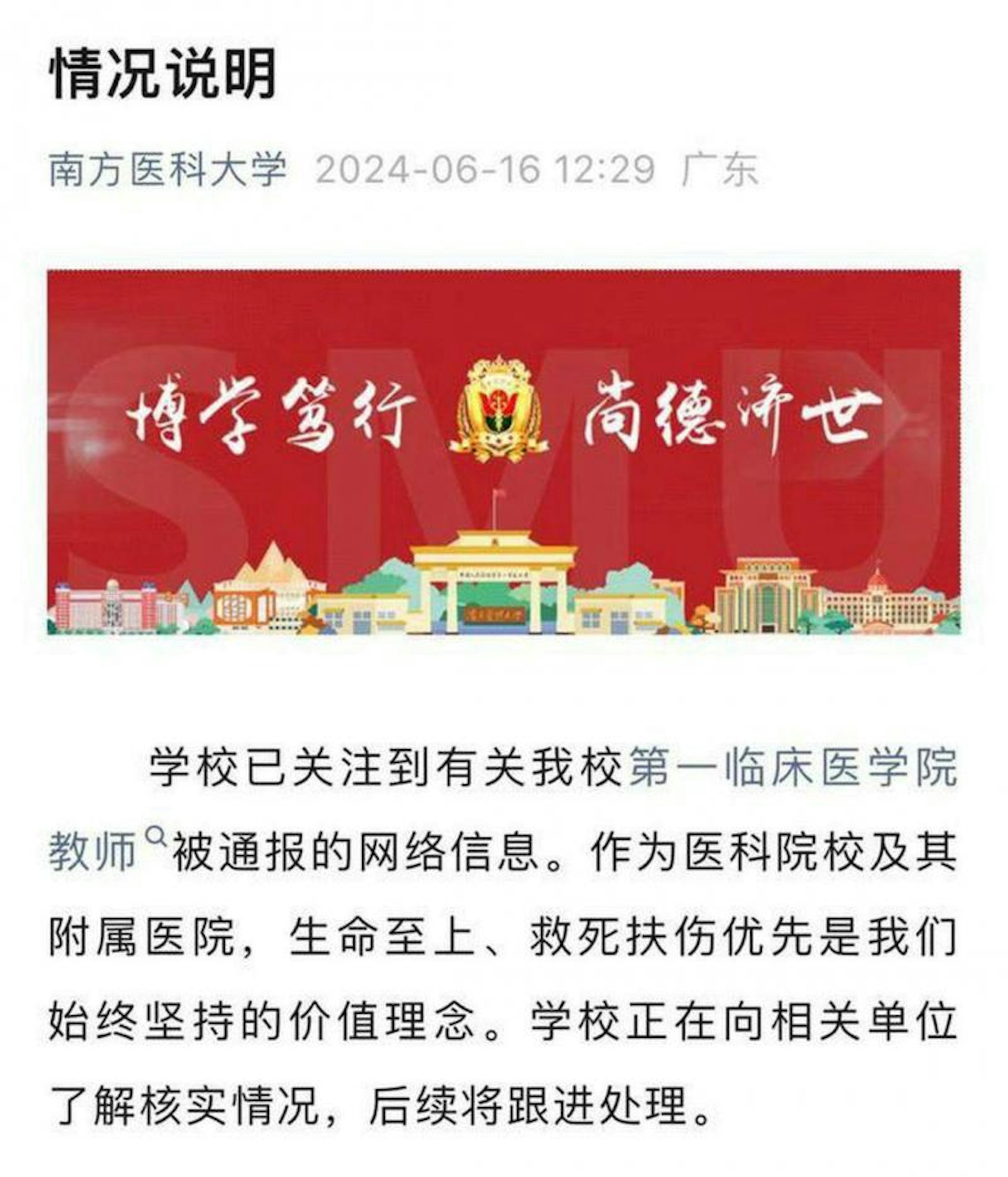 : R3 a3 ~, ]! w& h0 x% O南方醫科大學在其微信公眾號發布「情況說明」試圖管控輿論危機。(互聯網)