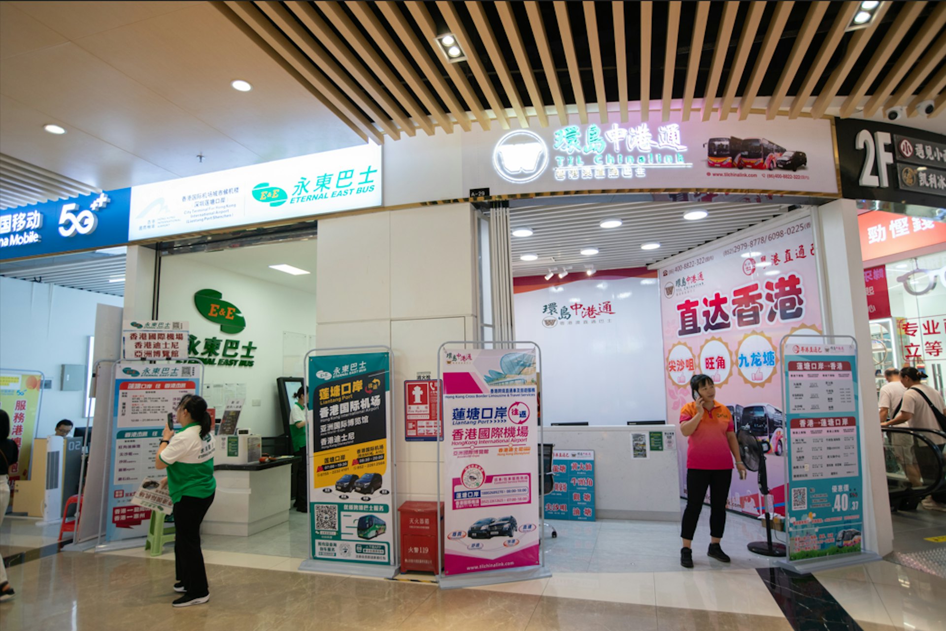 * Q) y" Z+ S. z# j0 S6 G" t公仔箱論壇一年過去2024年,蓮塘口岸所有商舖都已組滿,口岸往來旅客單日達到10萬人次。商業城內也入駐了巴士車票、銀行、兌換等店舖。(香港01 黃浩謙 攝)