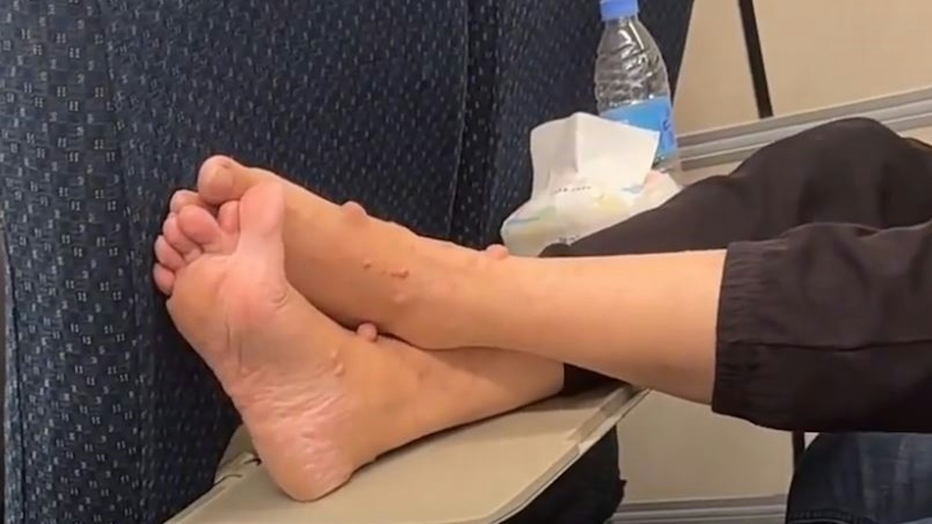 該乘客的雙腳長滿疙瘩,猶如一顆顆大小不一的「肉粒」,但他卻直接把腳交叉搭在座椅靠背後的小桌板上。(影片截圖)