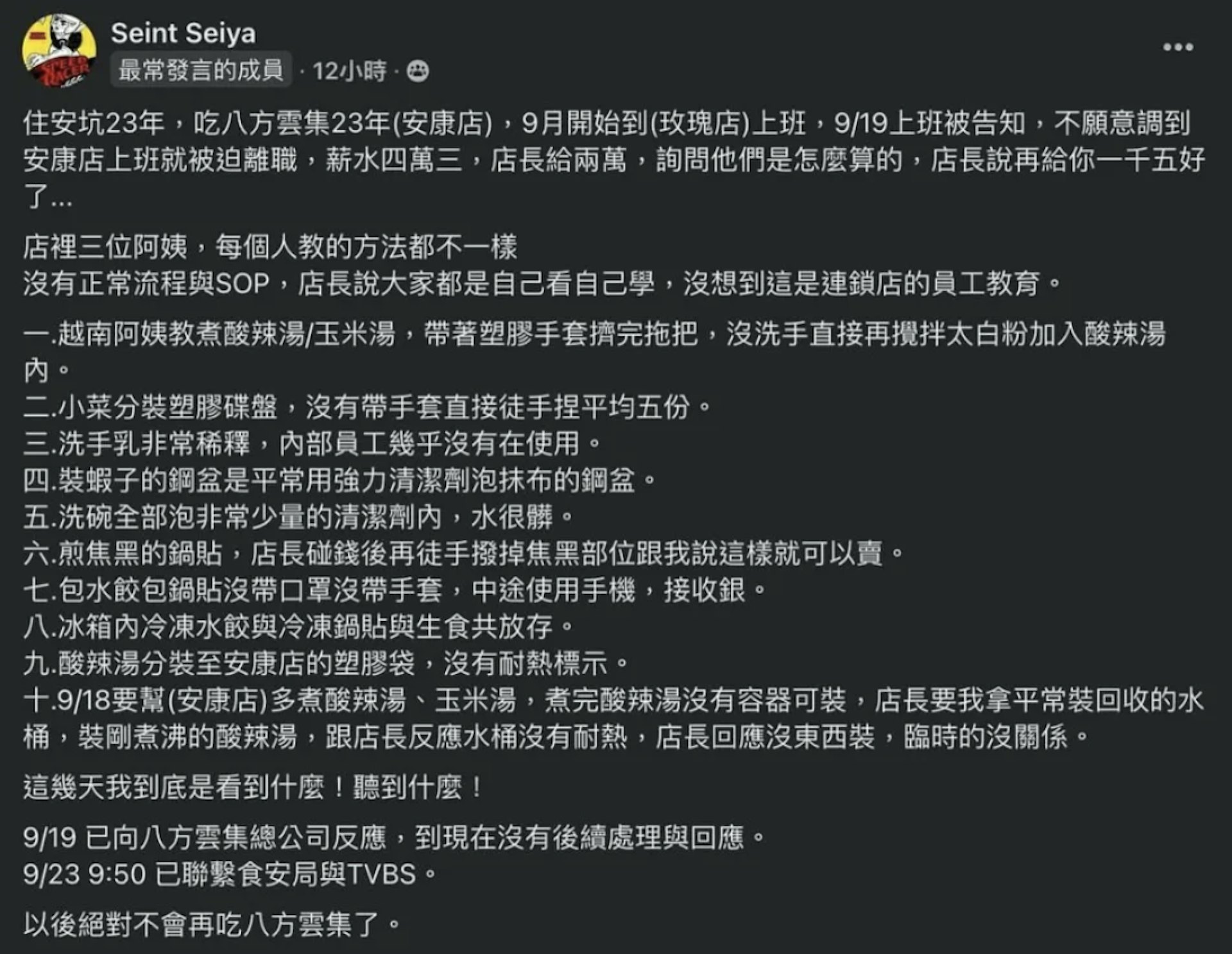 該前員工指出,自己9月19日接到離職通知,理由是不願意調到另家分店上班就被迫離職,當天也已向八方雲集總公司反應,卻沒有得到後續處理及回應,於是在23日聯繫食安局和媒體,希望能報料。