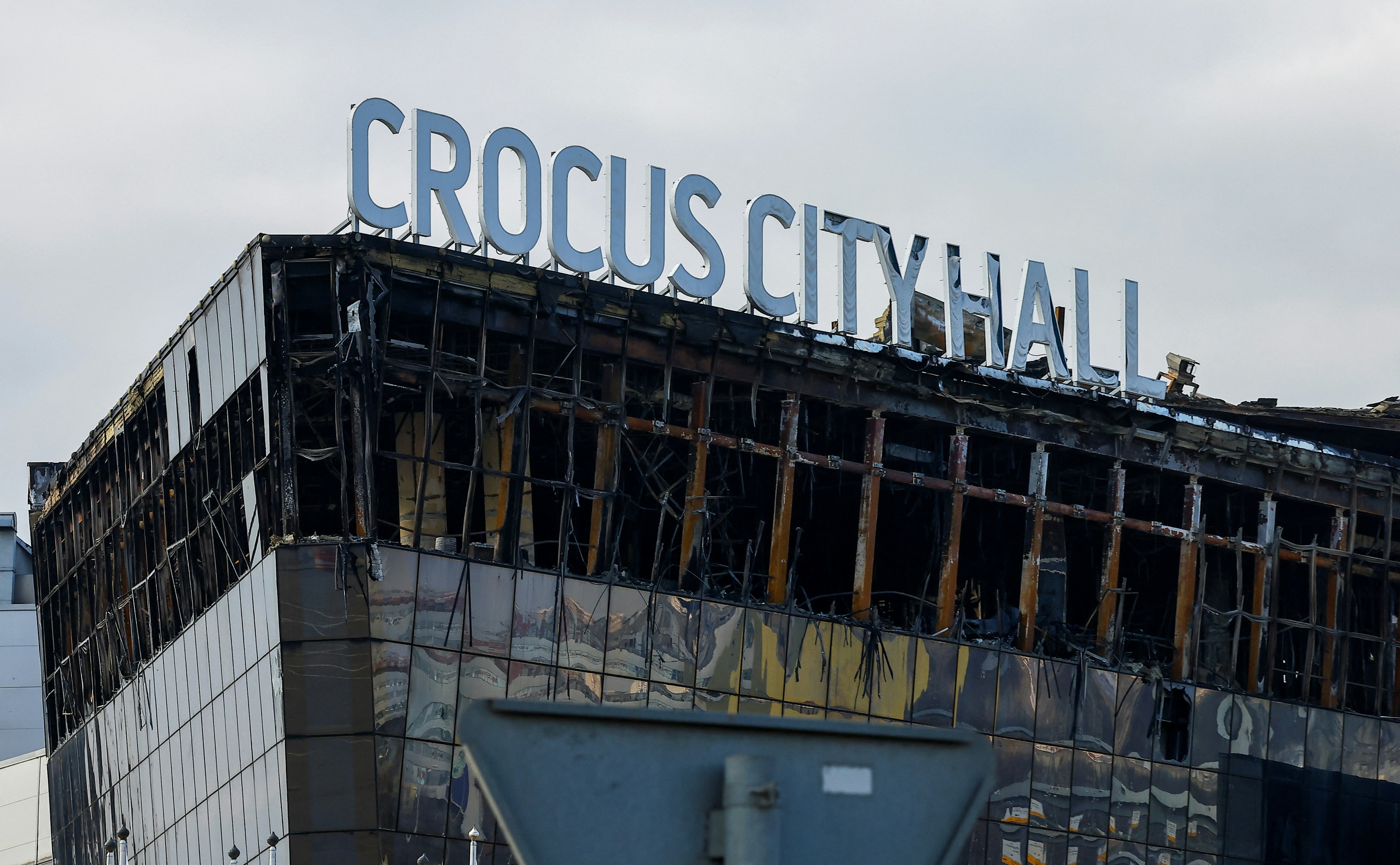 % [6 X9 q( O' M [ Y圖為2024年3月29日,鏡頭下在22日發生過恐襲的俄羅斯莫斯科克洛庫斯市政廳(Crocus City Hall,又譯番紅花市政廳)已燒毀不堪。(Reuters)