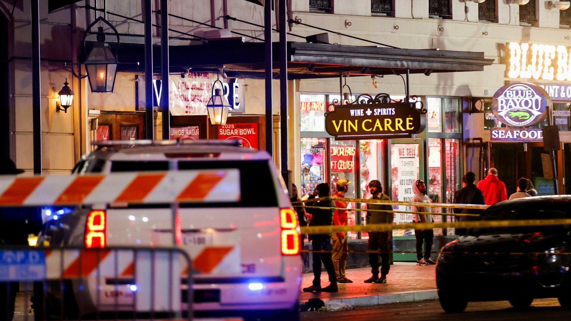 ; L+ F! H' d; a# \ n2025年1月1日,2025年1月1日,美國路易斯安那州(Louisiana)新奧爾良市(New Orleans)有汽車衝撞人群。圖為執法車輛和人員在事發現場附近工作。(Reuters)