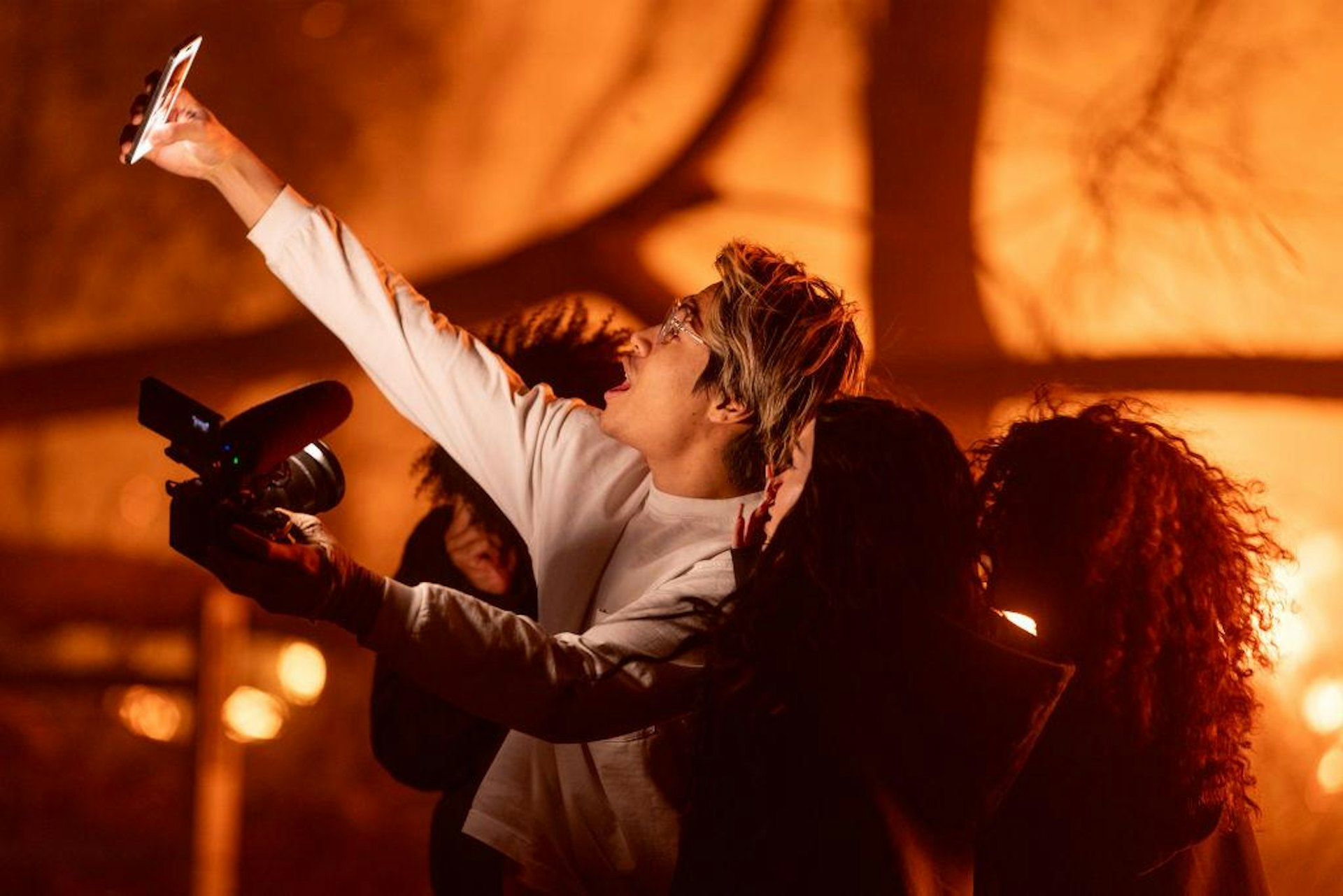 5 f- }7 u, w5 e* \ X5.39.217.762025年1月7日,美國加州洛杉磯以東的帕薩迪納伊頓(Eaton)受山火侵蝕,有居民在進入疏散區後和身後的大火自拍、錄影。(Getty Images)