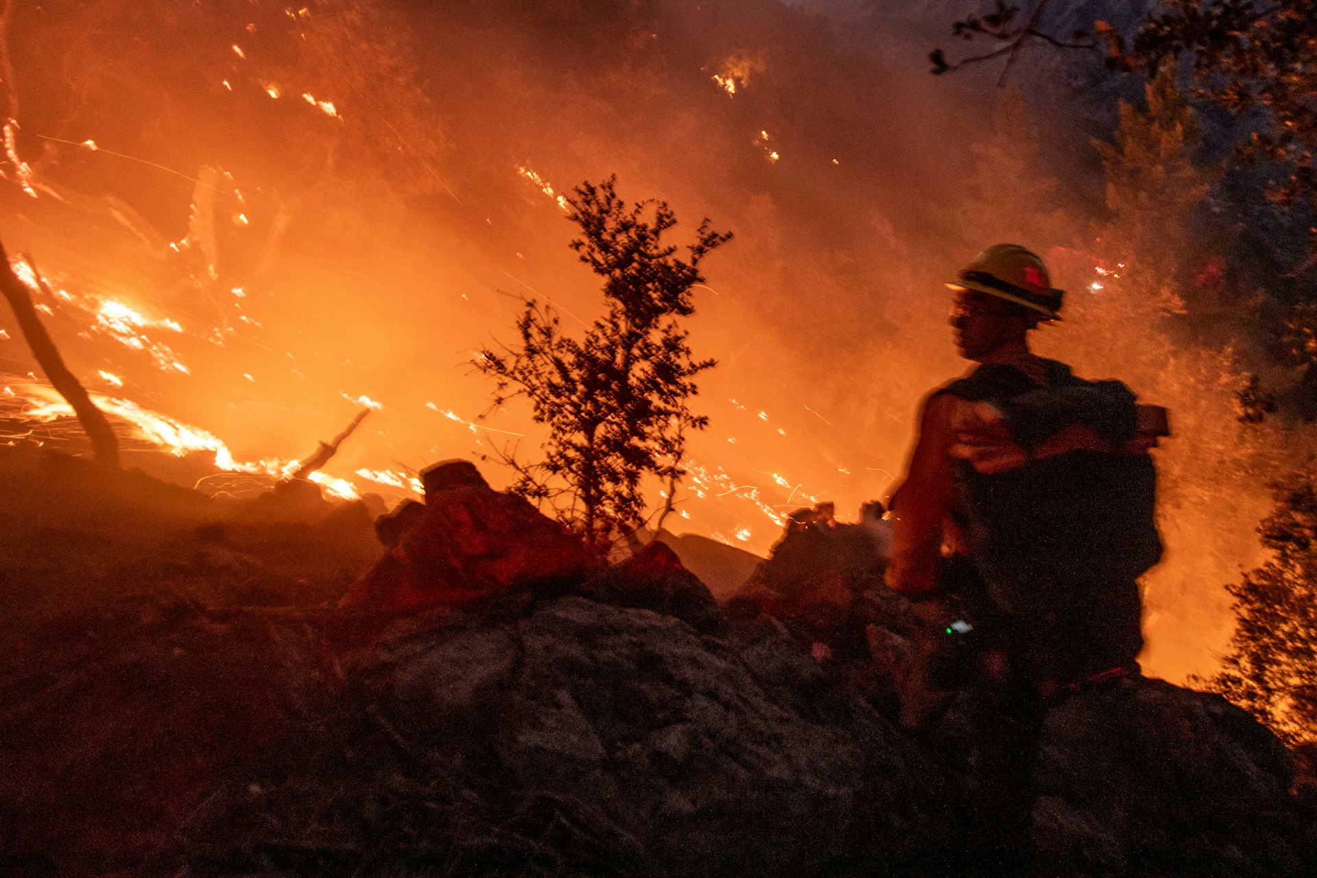 洛杉磯山火:Firefighters battle the fire in the Angeles National Forest near Mt. Wilson as the wildfires burn in the Los Angeles area, during the Eaton Fire in Altadena, California, U.S. January 9, 2025. (REUTERS)