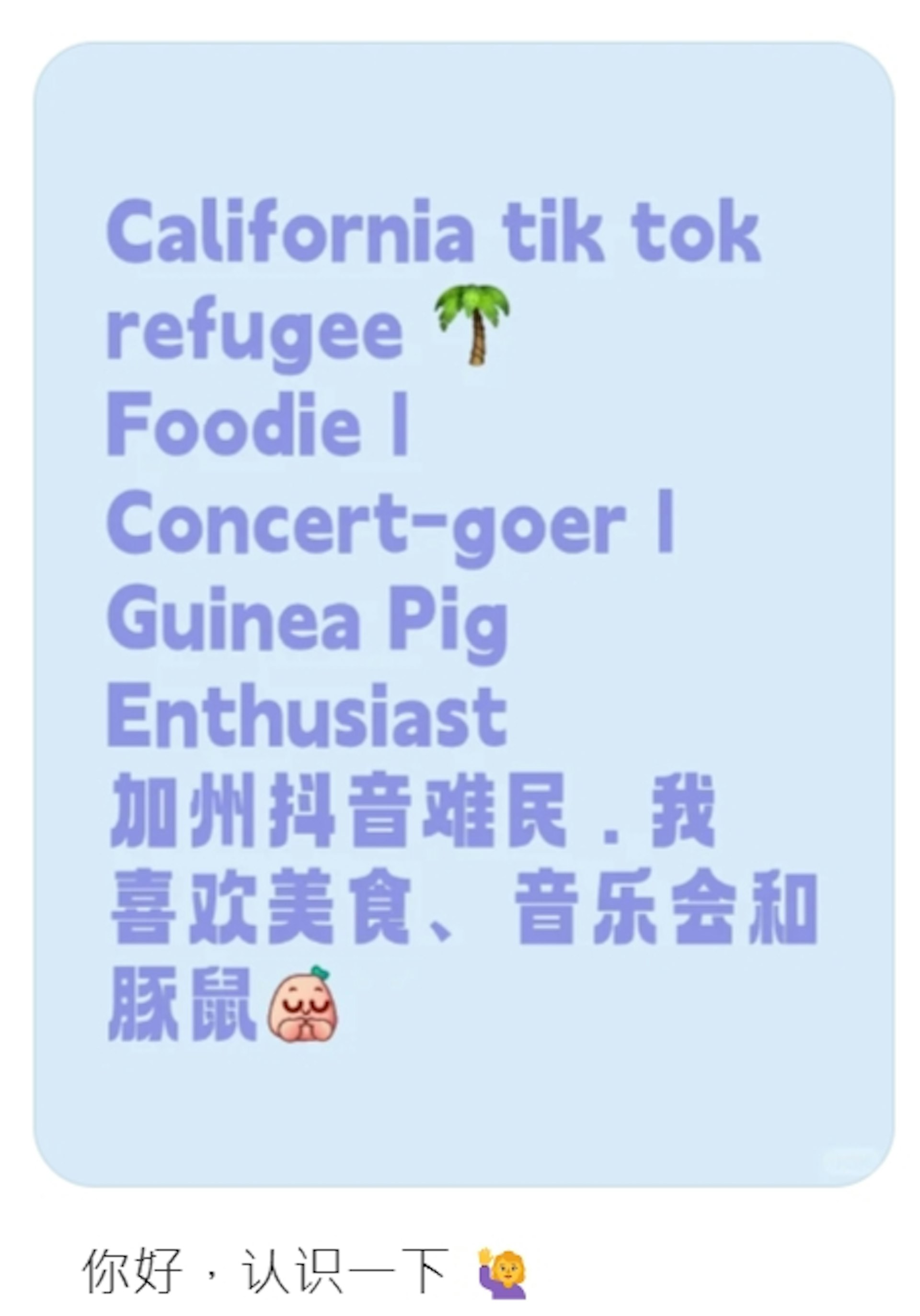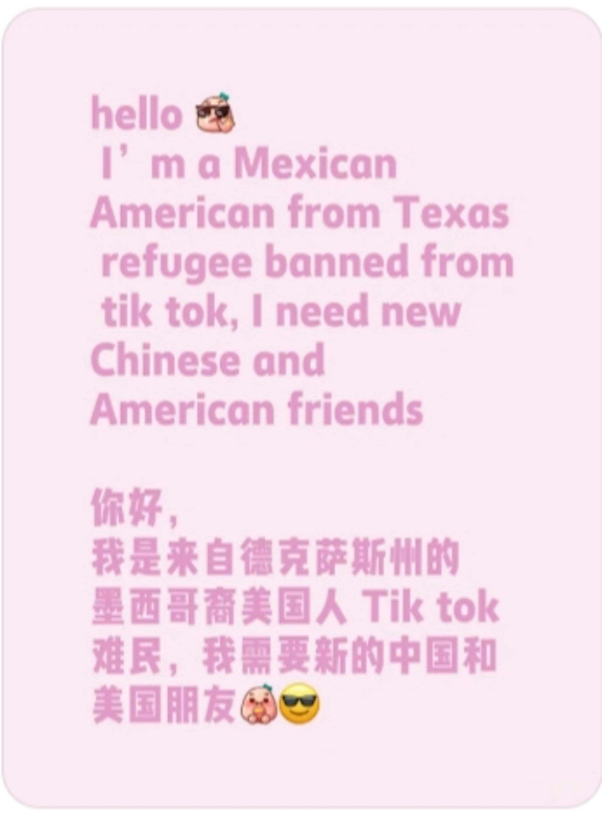 由於1月19號TikTok將被美國政府正式禁用,許多美國用戶將自己的上網陣營轉移到了小紅書上,他們自稱「tiktok refugees」(TikTok難民)。