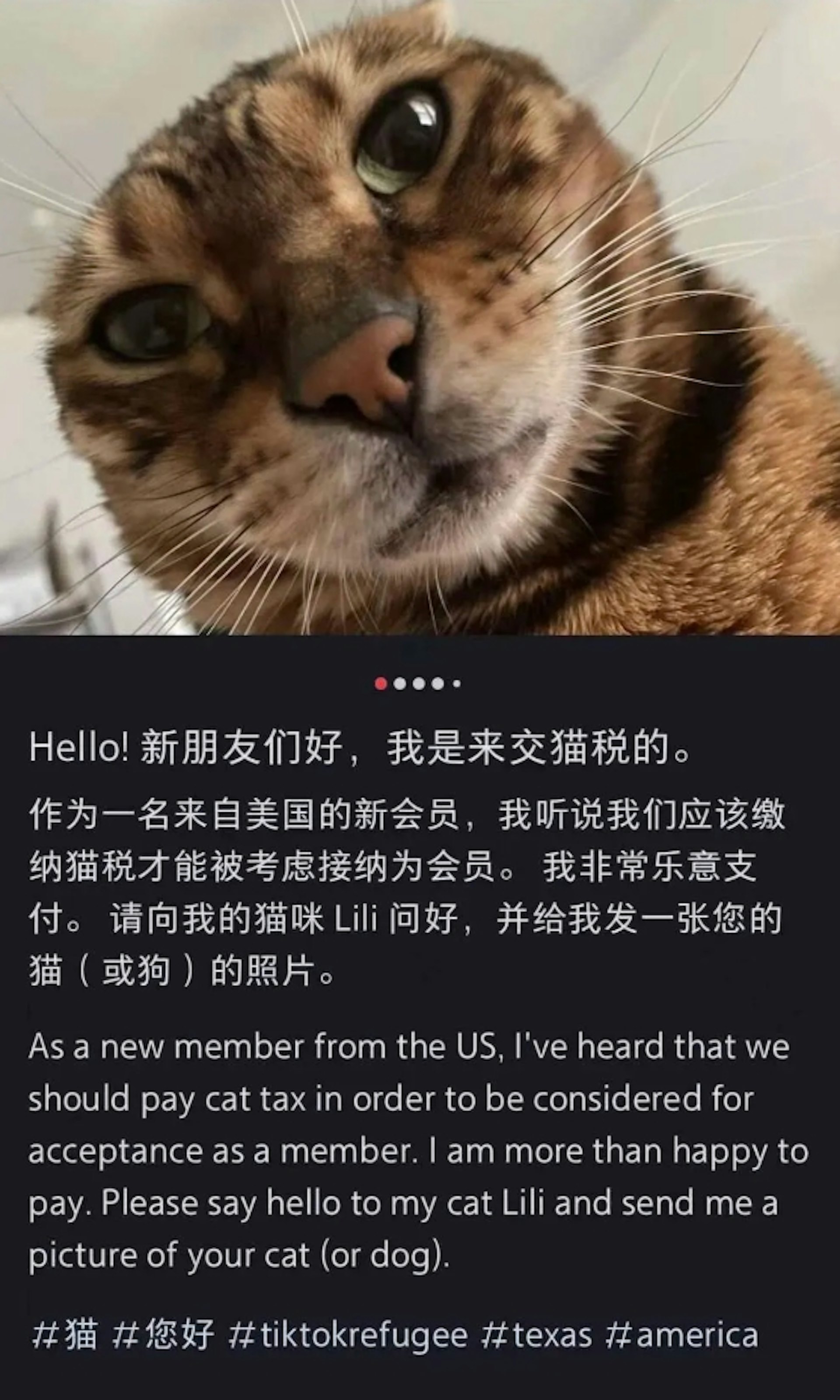 ; \5 X x; Y, s+ i8 t( q, KTVBNOW 含有熱門話題,最新最快電視,軟體,遊戲,電影,動漫及日常生活及興趣交流等資訊。這兩天的小紅書,幾乎在任何話題下,都能見到外國用戶的身影。最常見的是寵物話題,不知怎地,開始流行一條規則,美國人上小紅書要先繳納「cat tax」,也就是發布自己的貓咪照片。有網友總結出了專業的「貓稅收取確認書」,特別強調要定期繳納才能獲得發文資格。: `7 U' ?4 N8 ~6 Y7 V. ~& l