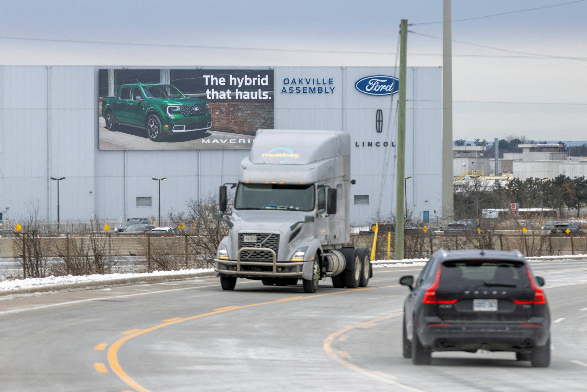 / O; a- c* `) @- Z8 V% X; G隨著美國關稅和加拿大採取報復措施,美加貿易緊張局勢升級,圖為加拿大安大略省奧克維爾一家福特(Ford)汽車組裝廠房。(Reuters)