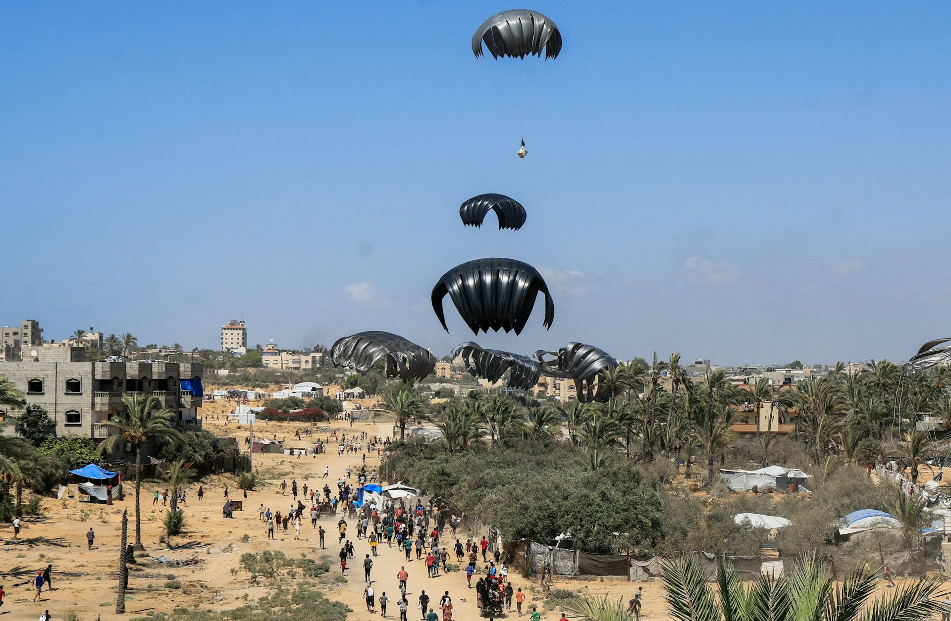 - S5 l% B1 J+ W; D; m7月31日,空投物資降落到加沙。(Reuters)