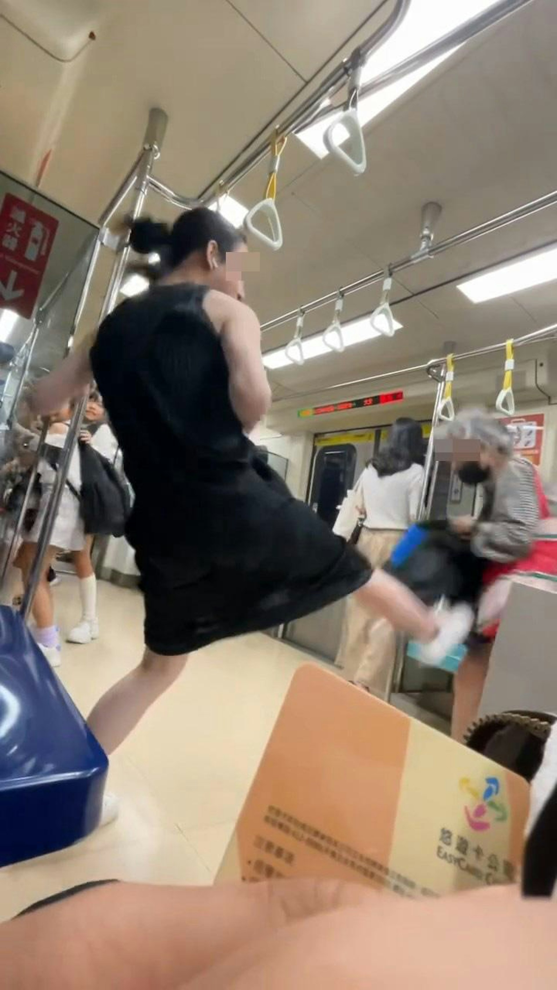 網上流傳影片長約1分鐘,只見捷運當時還有很多空位,但阿婆堅持坐在博愛座、穿裙子的「女子」讓座,並揮動手袋擊打「女子」膝蓋,傳出「啪」聲巨響。被重擊後,「女子」拜託旁邊的人拿着其手上的袋子,隨後怒目凝視阿婆,阿婆再揮袋擊打,「女子」即時伸腳擋開阿婆的袋,並站起來一腳大力踢在阿婆另1邊的袋上,阿婆失平衡跌坐後方座位上,一臉愕然。, N1 Q- L T" a- B. _