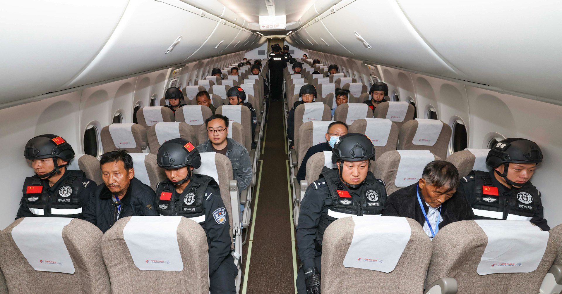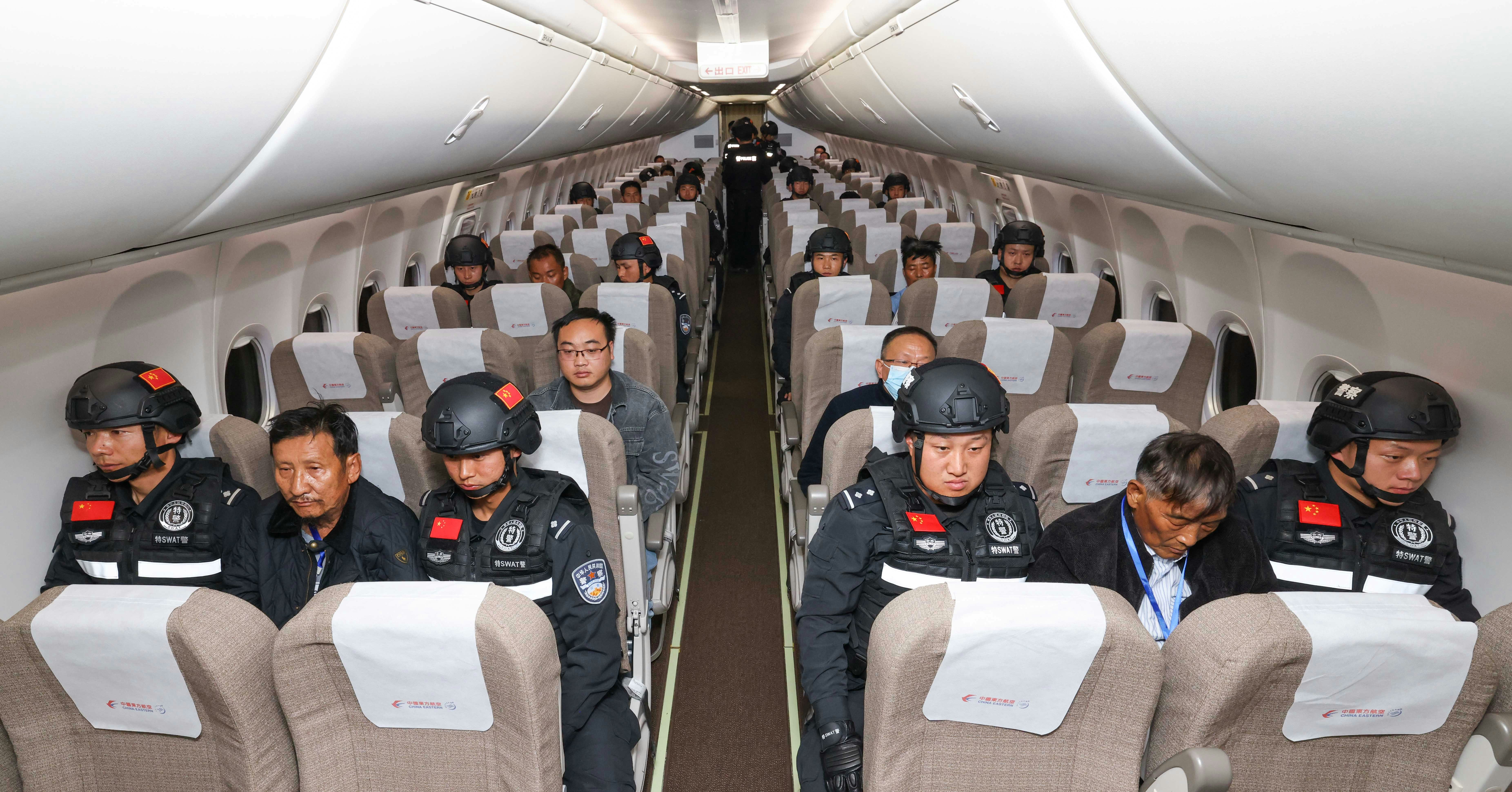 : Z$ H! Y' ~# C! [, k; }公仔箱論壇2024年1月30日,緬甸警方依法向中國公安機關移交的白所成、白應蒼、魏懷仁、劉正祥、劉正茂、徐老發6名緬北果敢電詐犯罪集團重要頭目和另外4名重大犯罪嫌疑人在被押解回國的飛機上。(新華社)